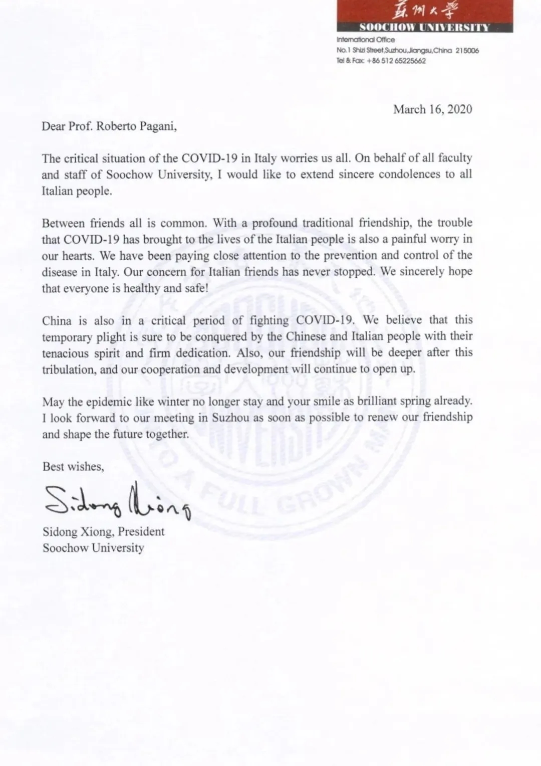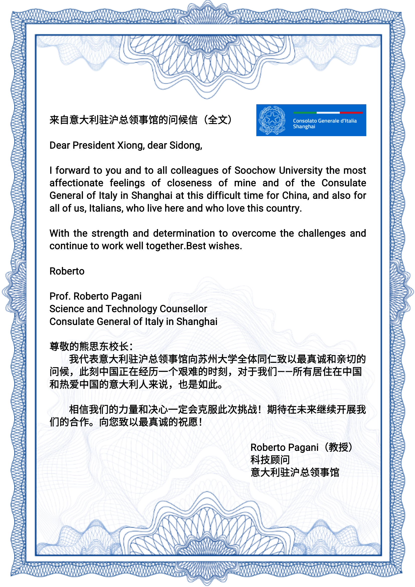 中意友谊源远流长,根基深厚。国内疫情爆发后,意大利驻沪总领事馆在第一时间致信熊思东校长表示慰问。疫情在意大利爆发后,熊思东校长也在第一时间致信问候意大利驻沪总领事馆科技参赞Roberto Pagani,信中表示,8868体育(中国)官方网站全体师生深切地牵挂着处于危难时刻的意大利人民,希望意大利朋友们顽强奋战,早日战胜疫情!