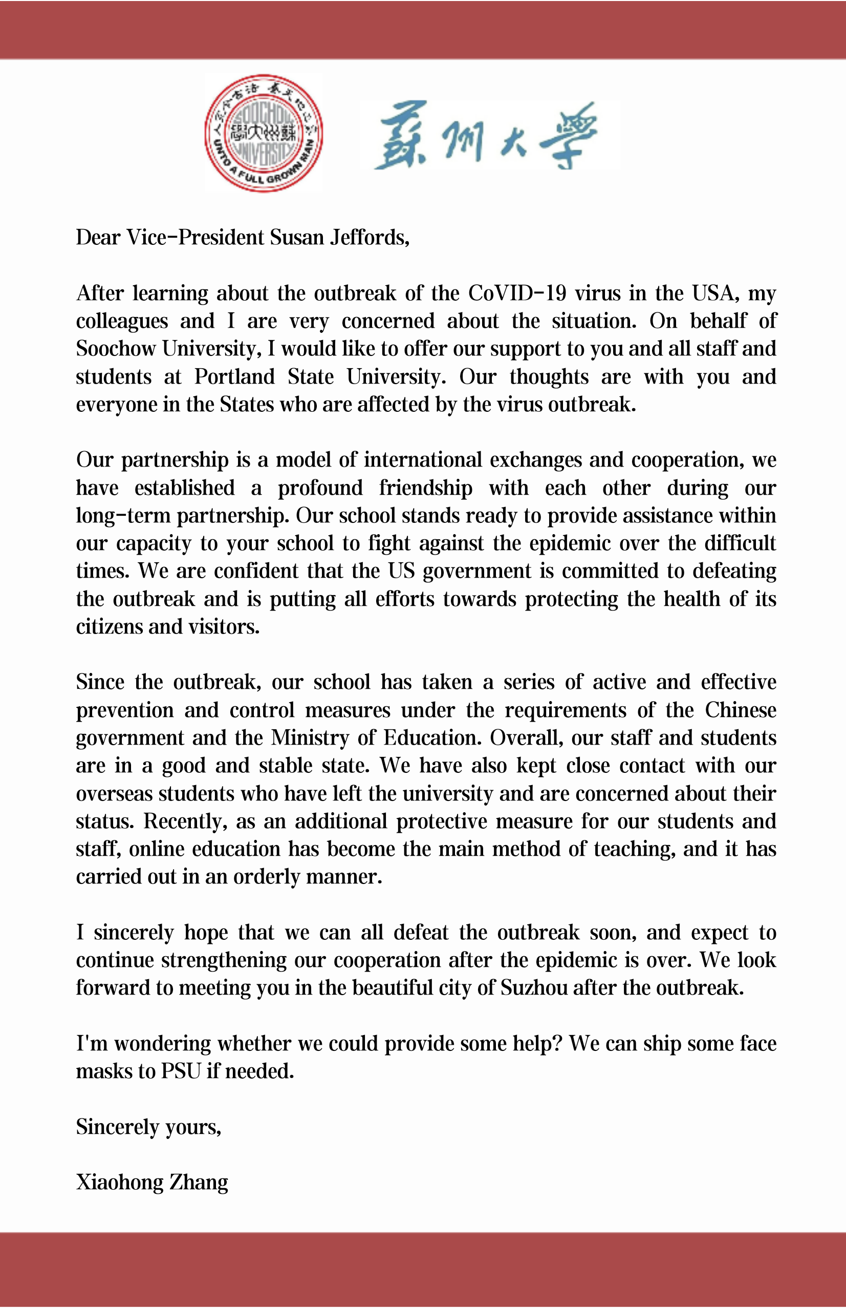 3月初,当美国俄勒冈州因疫情冲击而宣布进入紧急状态时,8868 SPORTS党委常委、副校长张晓宏在第一时间向波特兰州立大学教务长兼学术事务副校长Susan Jeffords致信问候,表达对波特兰州立大学全体师生的诚挚慰问,并表示8868体育(中国)官方网站非常愿意助力波州大共渡难关。