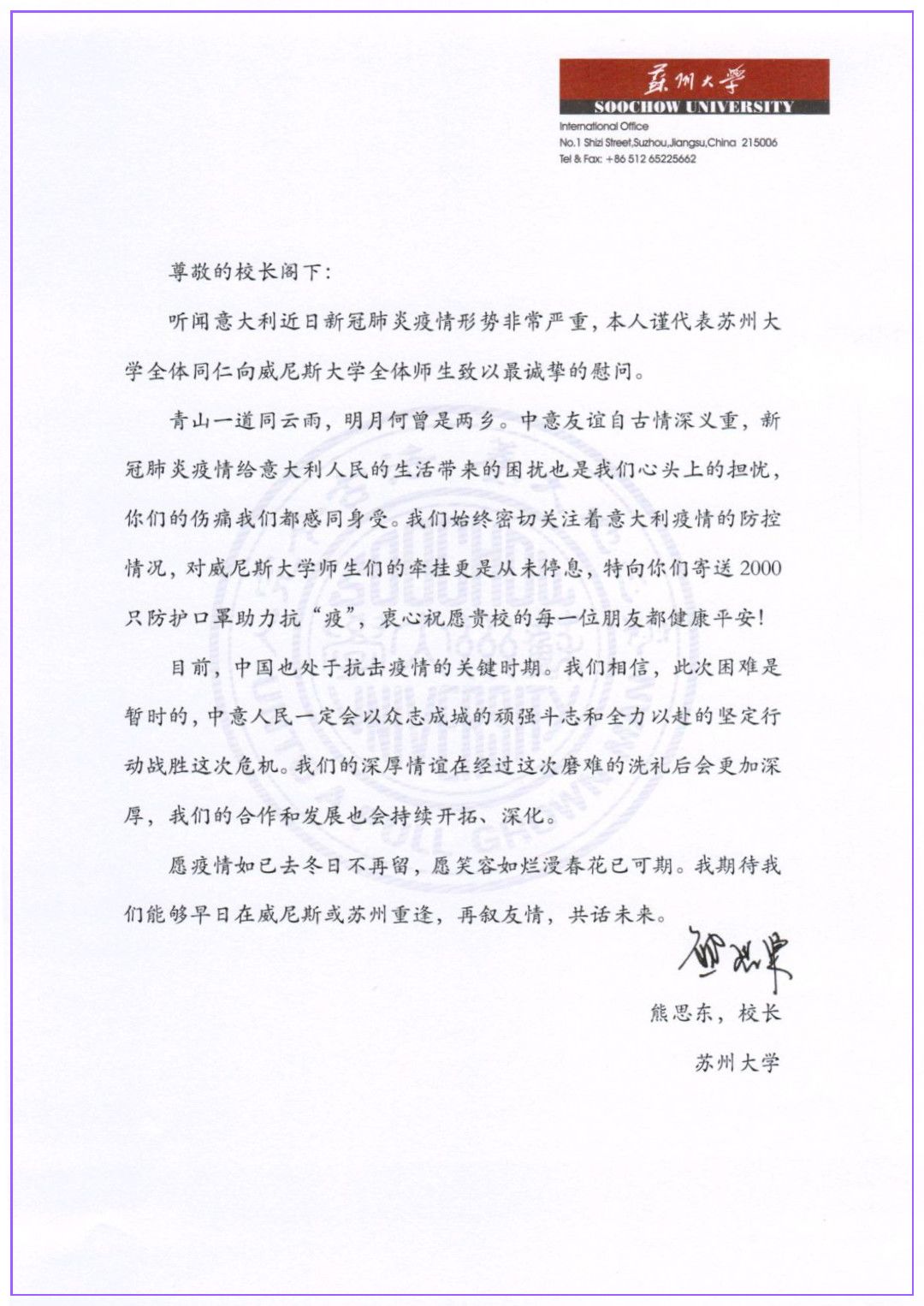 8868体育(中国)官方网站与威尼斯大学在2017年建立了战略合作伙伴关系。在意大利的疫情爆发以后,8868 SPORTS党委常委、副校长张晓宏在第一时间向威尼斯大学副校长Tiziana Lippiello发信慰问。在得知威尼斯大学防疫形势严峻,尤其物资紧缺的情况后,8868 SPORTS党委书记江涌和校长熊思东都万分挂念。熊思东校长代表8868 SPORTS全体师生向威尼斯大学校长Michele Bugliesi发去诚挚慰问,并表示急难有情,情有馀兮,8868体育(中国)官方网站将提供支持,唯盼师生朋友安康无恙。