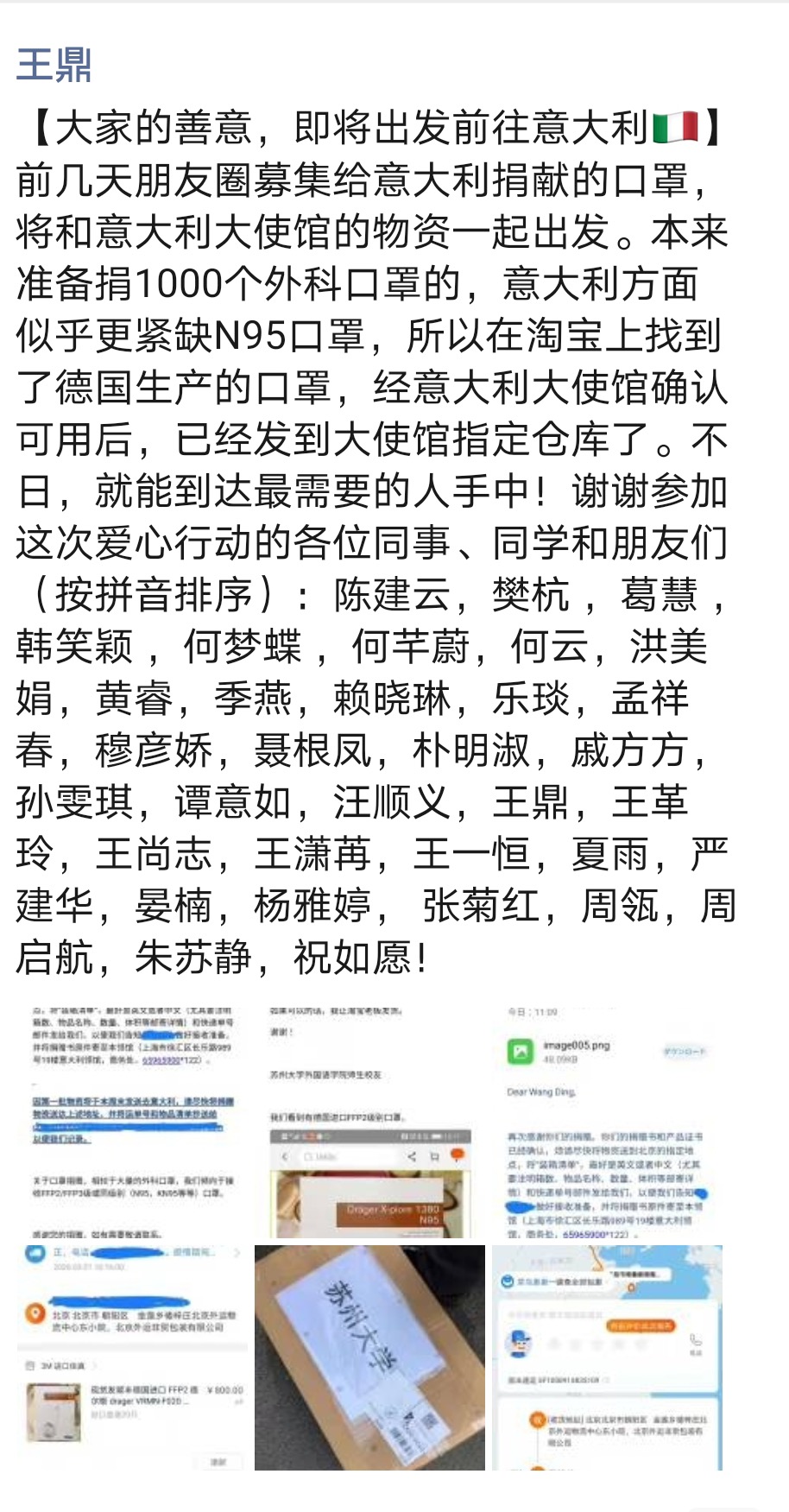 与此同时,8868 SPORTS各位师生也密切关注着意大利的疫情动态并积极开展口罩募捐活动。外国语学院师生及毕业院友在日语系主任王鼎的大力发动下,自主自发地募集了一批N95防护口罩,这批口罩已通过意大利驻沪总领事馆捐赠给威尼斯大学。
