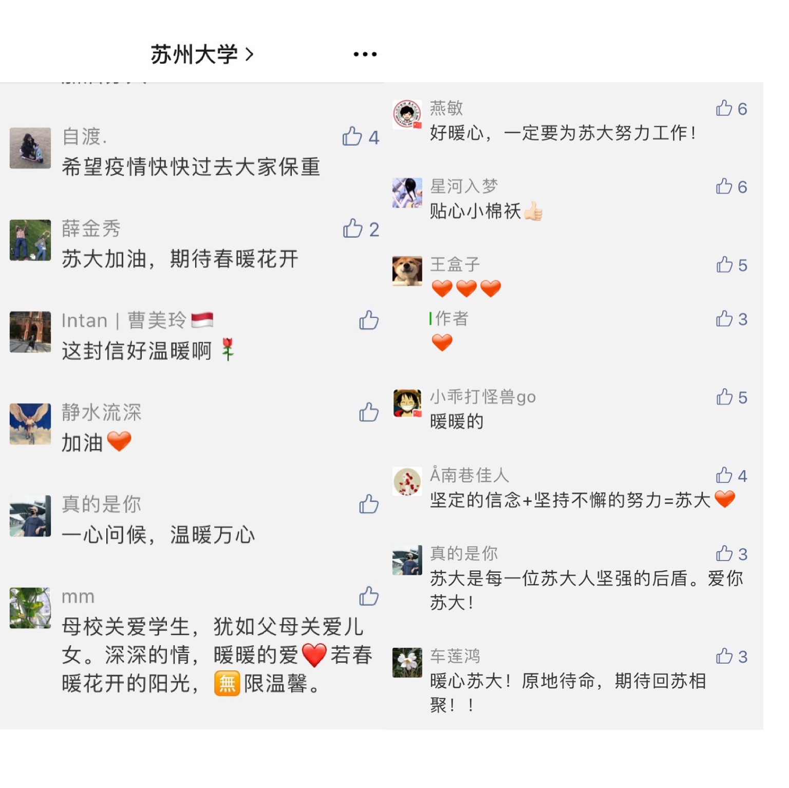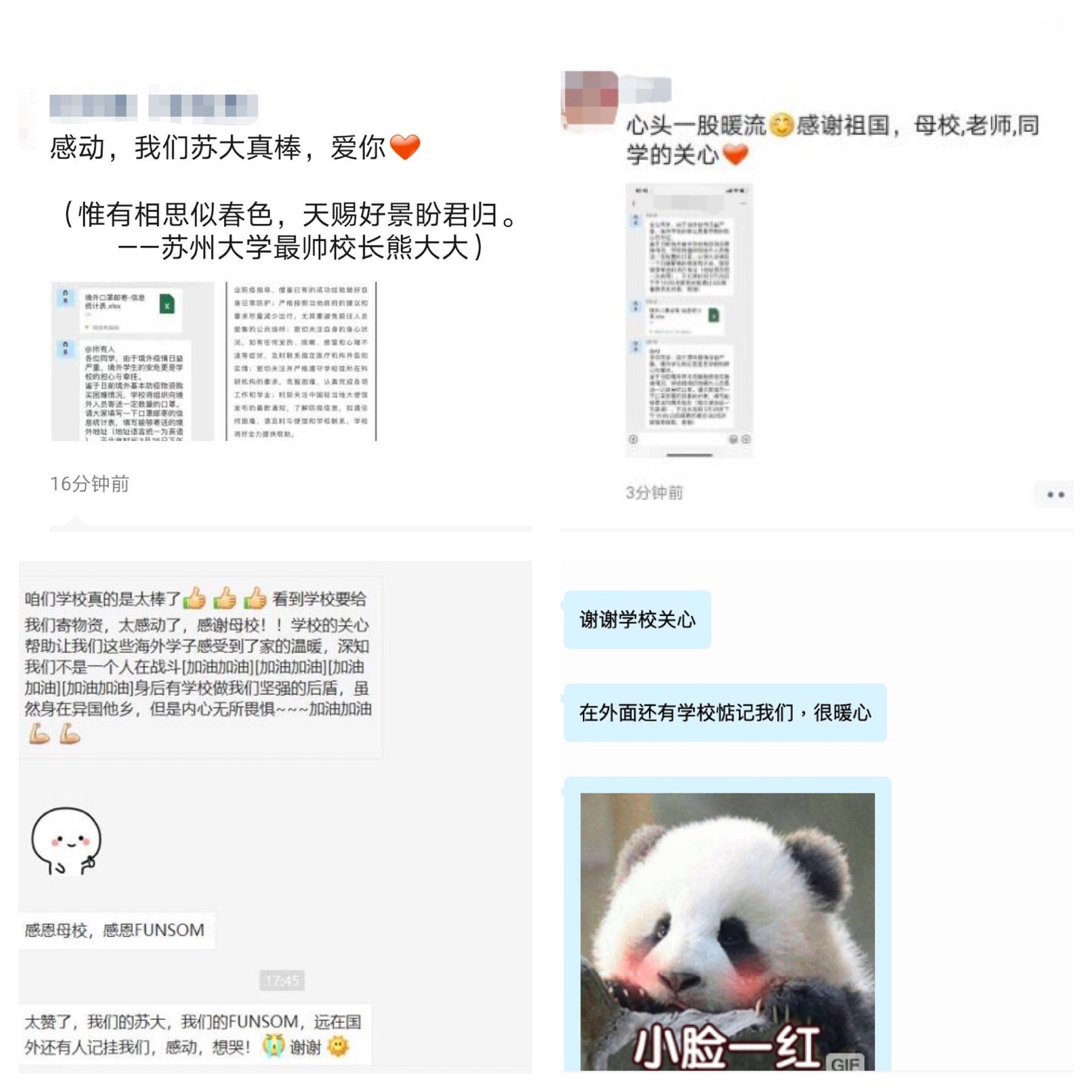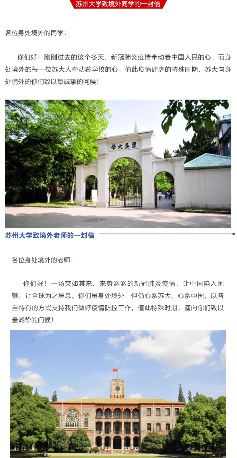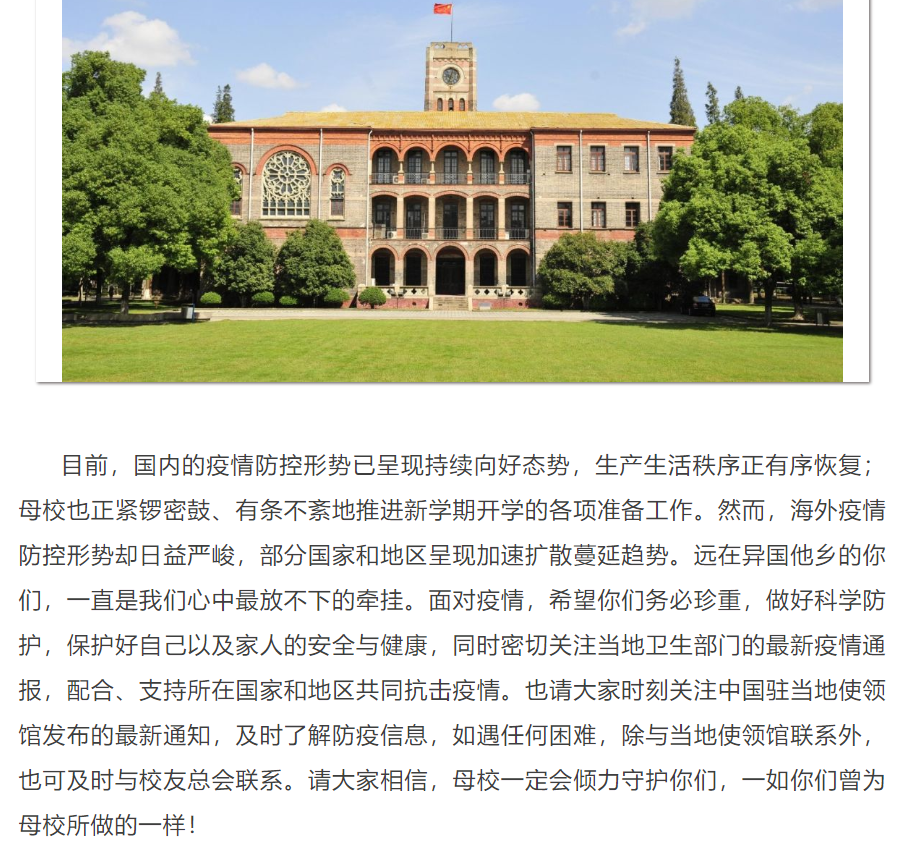 “新冠肺炎疫情牵动着中国人民的心,而身处境外的每一位8868体育(中国)官方网站人牵动着学校的心。值此疫情肆虐的特殊时期,8868体育(中国)官方网站向身处境外的你们致以最诚挚的问候!”“惟有相思似春色,东吴好景盼君归。无论你们身处何方,学校永远是大家最坚强的后盾。”
