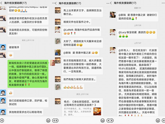 国内各校友组织除了积极响应校友总会发布的爱心动员令之外,还以多种方式热心支援海外校友。在校友总会组建的“8868体育(中国)官方网站海外校友援助群”内,国内校友们利用自己掌握的丰富的防疫经验和广泛的物资采购渠道,在第一时间与海外校友们的防疫需求进行精准对接。比如,组建了“慈善中医之家”医疗团队并且亲赴武汉抗疫一线的校友戴新瑞,不仅毫无保留地与海外校友们分享自己在抗疫一线取得的成功救助经验,还积极为大家提供中医药采购等支援服务。此外,对于有N95口罩等防护物资需求的海外校友,广大国内校友也纷纷与之积极对接并提供最大支持。