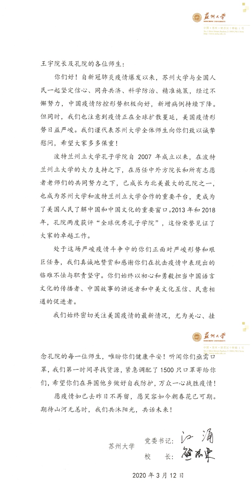 3月12日,8868 SPORTS疫情防控领导小组副组长、保障工作组组长、党委常委周高总会计师紧急调配1500只医用级防护口罩,并在第一时间寄往波特兰州立大学孔子学院,与之一起寄出的是全体8868体育(中国)官方网站人的祝福和期盼:愿全体海外汉语教师健康平安、无恙归来!