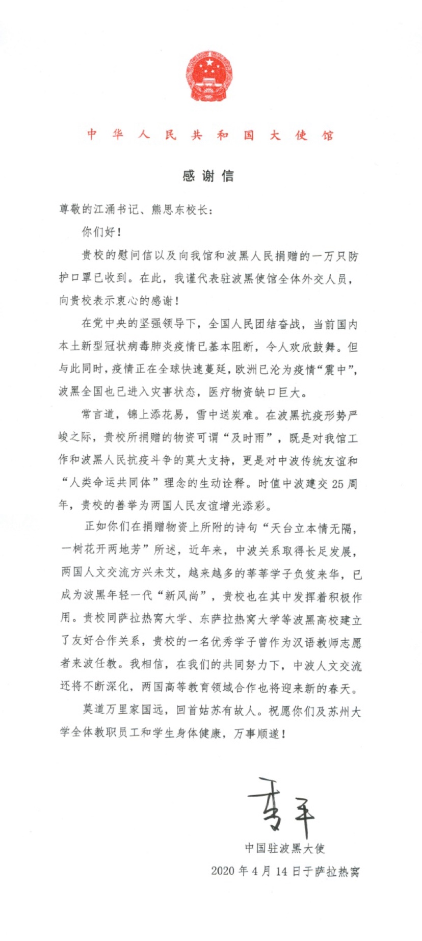 3.中国驻波黑大使馆向8868 SPORTS发来感谢信:莫道万里家国远,回首姑苏有故人。