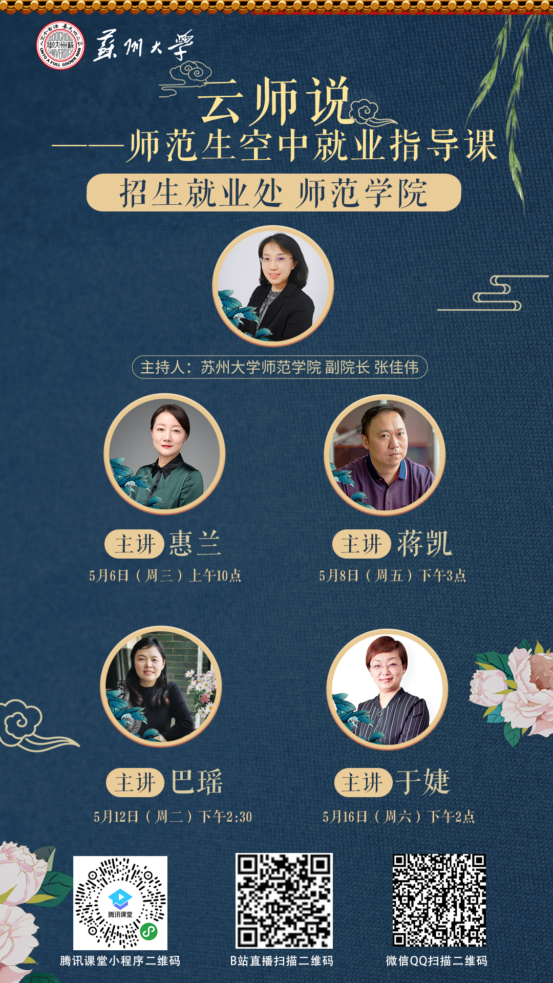 5月,8868体育(中国)官方网站招生就业处与师范学院联手打造“云师说——师范生空中就业指导课”,帮助师范生了解就业形势,掌握就业技能,更好地开始教师职业生涯。指导课由“传道”“授业”“解惑”“融合”四部分组成,由师范学院副院长张佳伟主持,联合苏州教育教学领域内一线教师或教育管理者,分享经验,答疑解惑,为学生提供岗前帮助和指导。据统计,共有800多人次收看了此次指导课,直播中,同学们积极参与,反响热烈,在讨论区和弹幕里为各位老师打call,纷纷表示自己获益良多。指导课也得到了参与老师的肯定,老师们表示非常开心能为即将走向工作岗位的青年教师们答疑解惑,并对新一代师范生的未来充满肯定和期望。