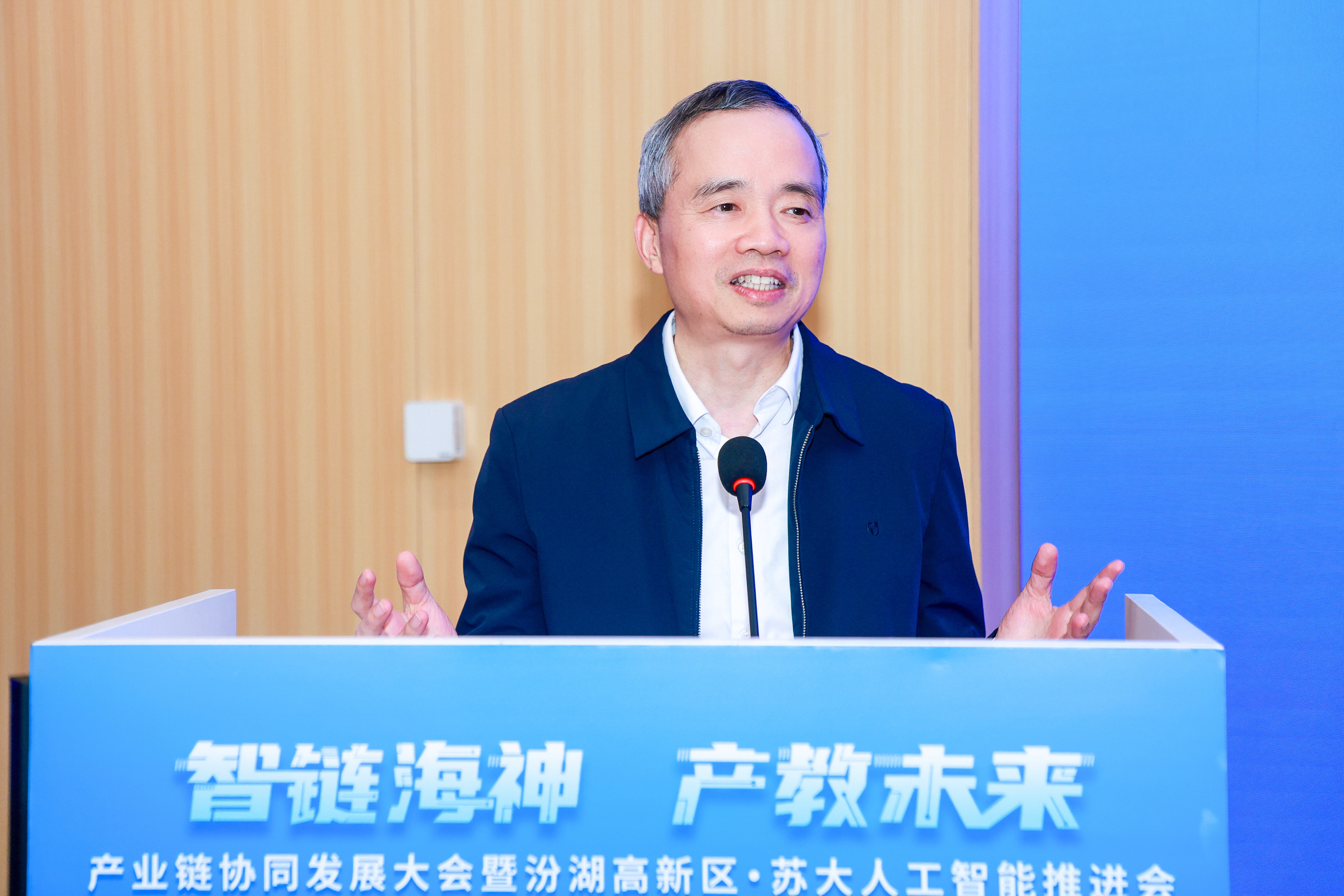 10月29日下午,“智链海神·产教未来”产业链协同发展大会暨汾湖高新区·8868体育(中国)官方网站人工智能推进会在8868 SPORTS未来校区召开。8868 SPORTS党委副书记、副校长沈明荣,吴江区委常委、汾湖高新区党工委书记陈建忠,吴江区副区长陈琦出席活动,未来校区管委会主任、未来科学与工程学院党委书记吉伟,未来科学与工程学院常务副院长王进,未来校区管委会副主任刘超,神尔机器人科技(苏州)有限公司、海神香港有限公司董事长于明坤等参加活动。