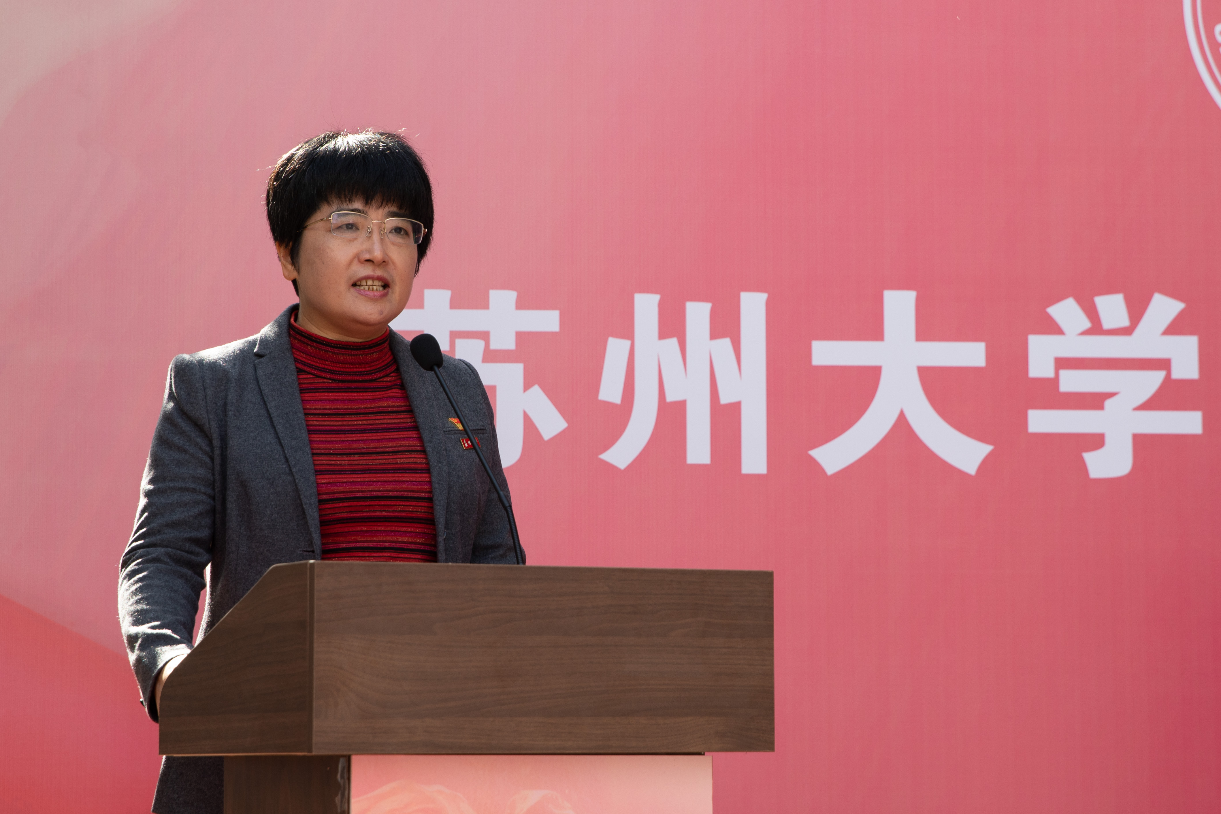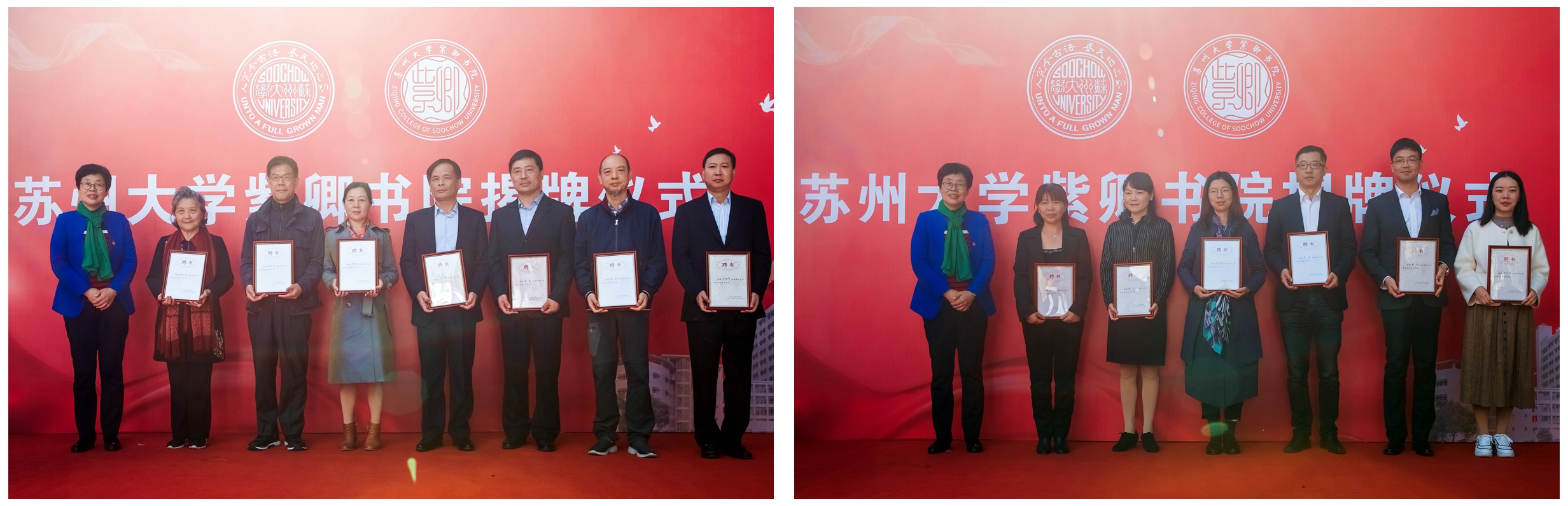 熊思东校长,郑辟疆先生亲属黄征宙,苏州丝绸博物馆原馆长、著名丝绸专家、宋锦技艺国家级传承人钱小萍,学生代表何芳妮共同为紫卿书院揭牌。