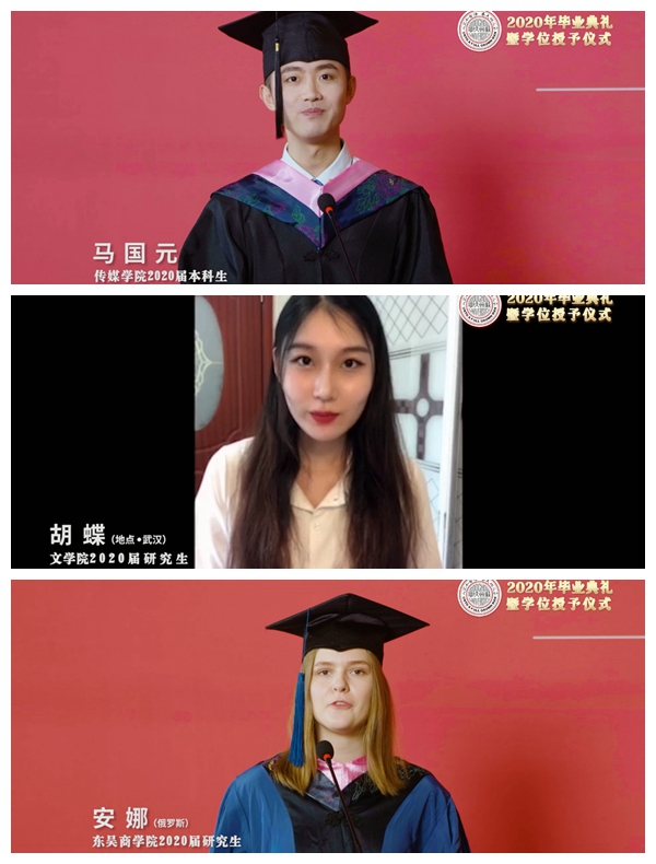 毕业典礼上,在萌萌的AI机器人小苏的全程主持下,传媒学院2020届本科生马国元、文学院2020届研究生胡蝶、东吴商学院2020届研究生安娜依次作为毕业生代表发言,他们感恩母校的关爱与培养,表达了对8868体育(中国)官方网站的祝愿与对未来的无限期许。