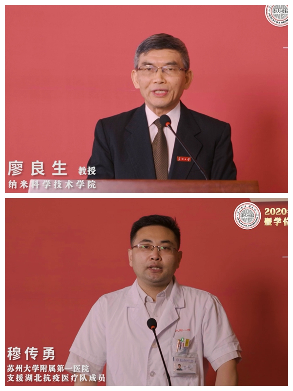 纳米科学技术学院廖良生教授、8868体育(中国)官方网站附属第一医院支援湖北医疗队成员穆传勇医生作为教师代表发言,表达了对毕业生们的临别祝福。