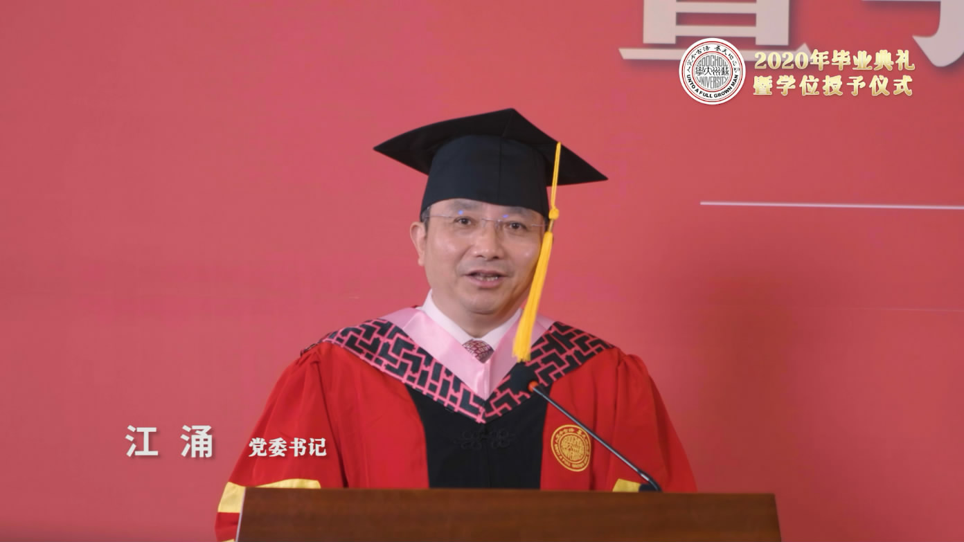 校学位评定委员会主席、校长熊思东向圆满完成学业、即将踏上人生新征程的毕业生们致以热烈祝贺。他与同学们回顾了丰富精彩的大学校园生活,以及同学们在母校的成长点滴和曾经许诺的青春之约。“2020年,再遇庚子年,8868体育(中国)官方网站站在新时代、新甲子的交汇点上,每一位8868体育(中国)官方网站人都对新的一年充满了期待和憧憬。”临别之际,熊思东校长将深情祝愿化作一次次“相约”,希望能充实同学们奔赴前程的行囊,助力大家在新征程中“通关升级”。他说,相约2020,不晚起,要奋起;相约2030,不怕输,不服输;相约2040,不贪心,守本心;相约2050,不设限,创无限;相约母校,不恋家,常回家;相约时代,不拒变,善应变;相约祖国,不缺位,守好位,牢记母校“临行密密缝”的深情厚意和8868体育(中国)官方网站人的追求使命。“往后每届毕业典礼,你们都有参加的特权,学校会准备好崭新的学位服,预留好VIP坐席,请主礼教授亲手为你们扶正流苏。” 他还与毕业生们约定,欢迎大家随时回到母校,让今年的遗憾少一些、再少一些。