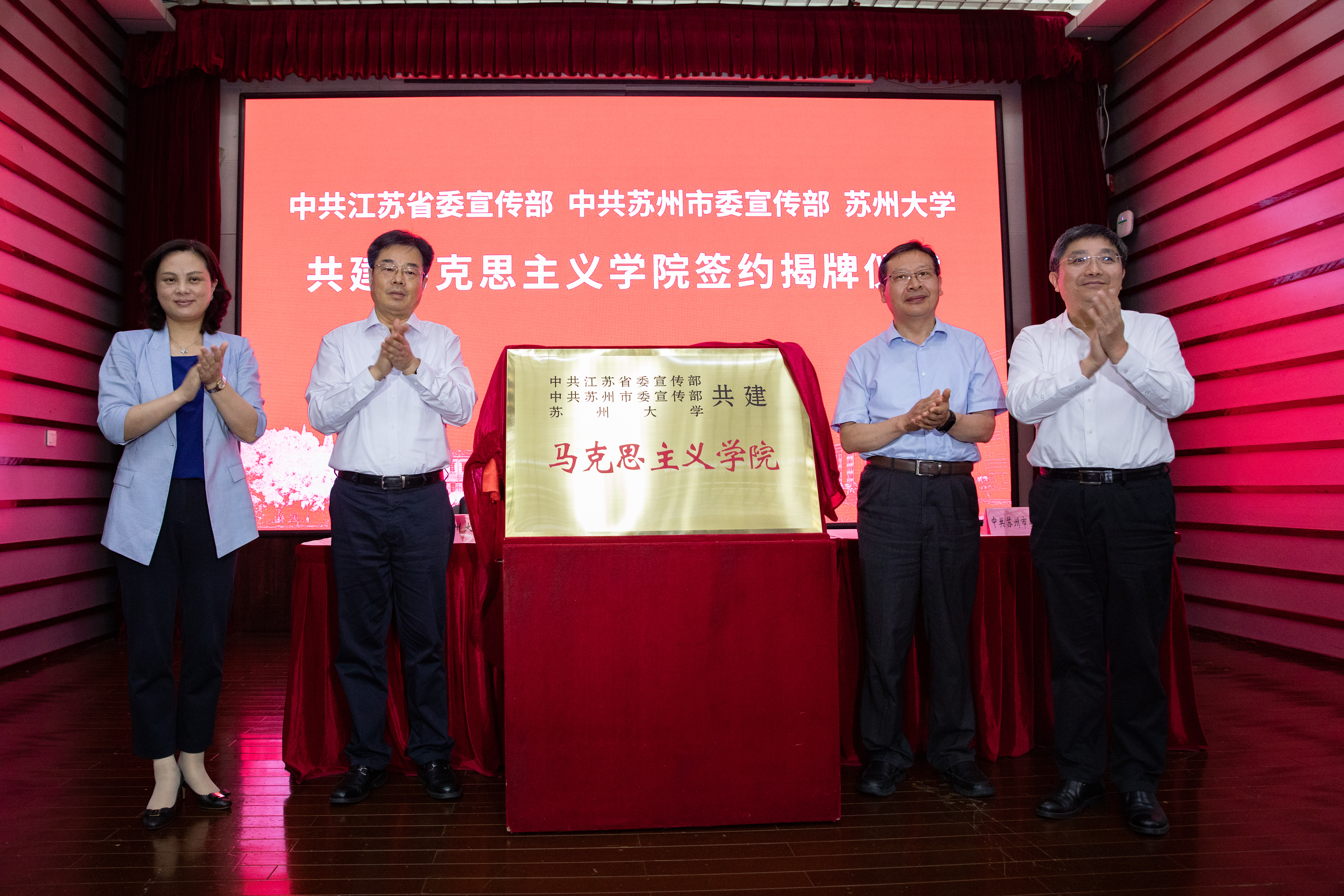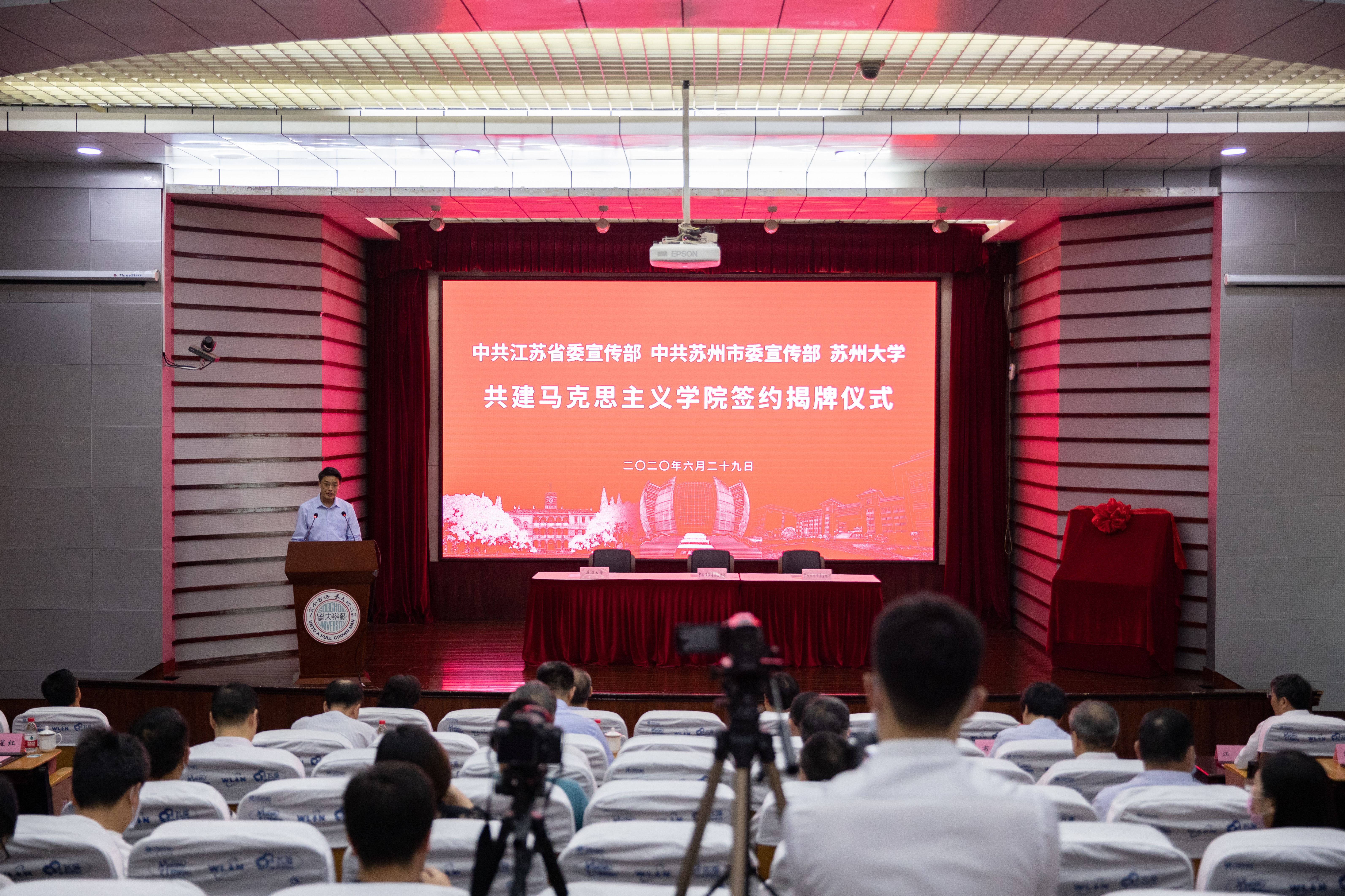 6月29日上午,江苏省委宣传部、苏州市委宣传部、8868体育(中国)官方网站共建马克思主义学院签约揭牌仪式在本部学术报告厅举行。省委宣传部常务副部长、省新闻出版局(版权局)局长、省电影局局长焦建俊,省委宣传部副部长赵金松,省委教育工委副书记、省教育厅党组成员徐子敏,新华日报社副总编李扬,省社科联党组成员周瑞峰,省社科院党委委员、副院长章寿荣,省委党校马克思主义学院院长布成良,苏州市委常委、宣传部部长金洁,《群众》杂志社政治处处长丁和平,省委宣传部理论处处长刘必好,省教育厅社政处处长王伟,苏州市委宣传部副部长、市新闻出版局(版权局)局长黄锡明,8868 SPORTS校领导江涌、熊思东、蒋星红、周高、张晓宏,省委宣传部、省委教育工委等相关职能处室负责人、苏州市相关单位负责人、8868体育(中国)官方网站相关职能部门负责人和师生代表参加仪式。仪式由校党委副书记邓敏主持。