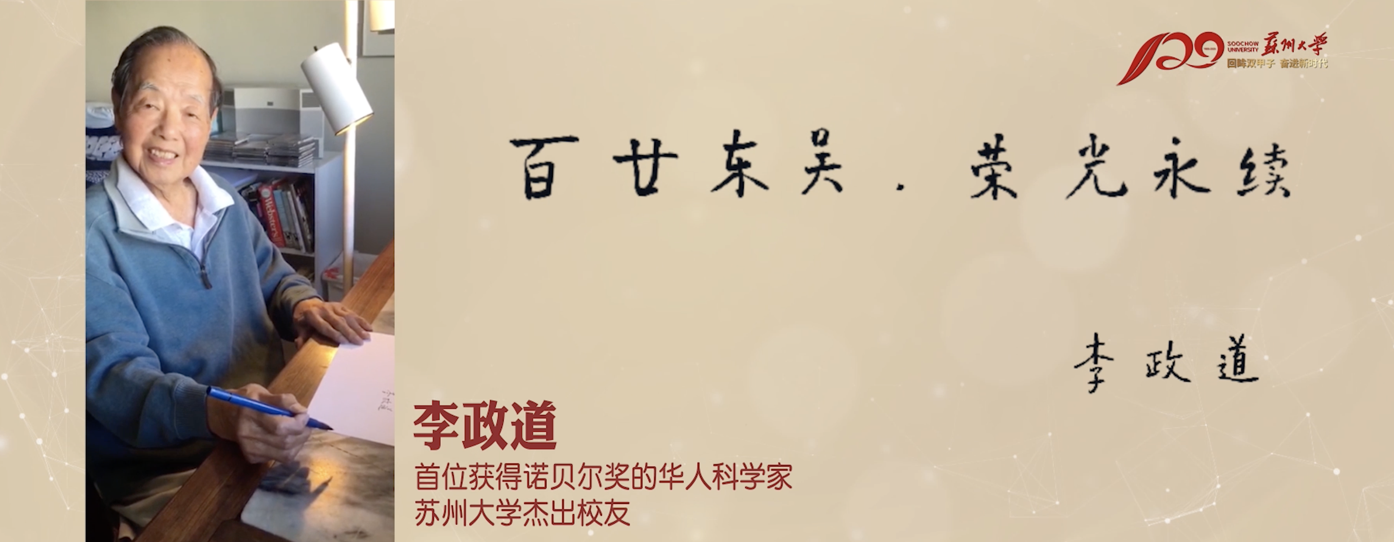 李政道博士一直关心母校的建设发展,心系祖国青年学生成长成才。为了这次发展大会,他特意录制了一段视频,并亲笔书写了 " 百廿东吴,荣光永续 " 八个大字赠予母校。各地校友会也纷纷通过“云视频”的方式,为母校120周年华诞送上祝福。