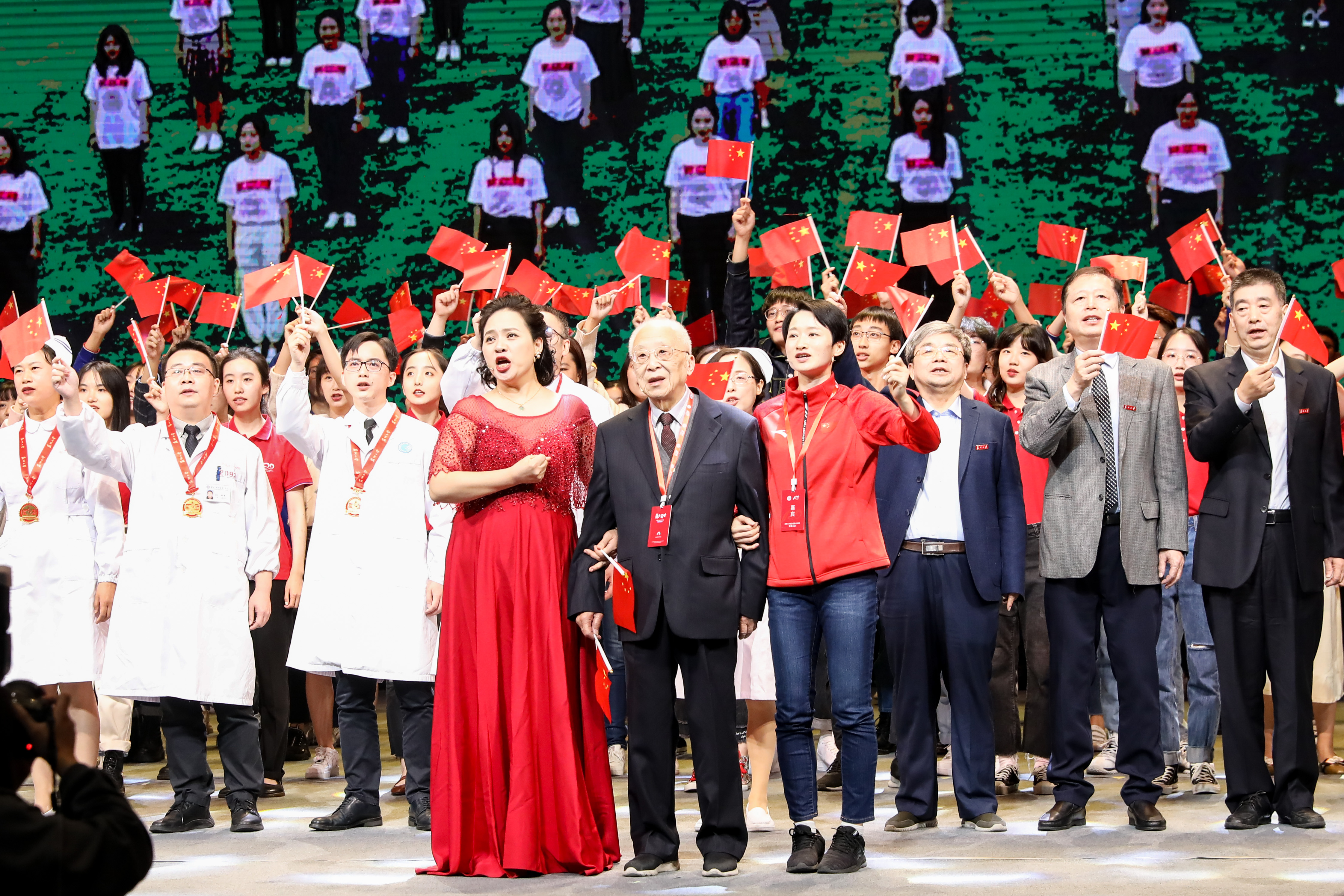 " 一条大河波浪宽,风吹稻花香两岸 ……"随着歌曲《我的祖国》响起,再次将发展大会的现场推向高潮。会场中,已90岁高龄、从事科研工作 68 年的中国工程院院士、8868体育(中国)官方网站现代光学研究所研究员潘君骅起身领唱。随后,奥运冠军、8868体育(中国)官方网站校友吴静钰挥舞国旗起身歌唱。8868体育(中国)官方网站音乐学院声乐系老师、江苏省音乐家协会会员董艺媛的女高音激昂澎湃,点燃全场!