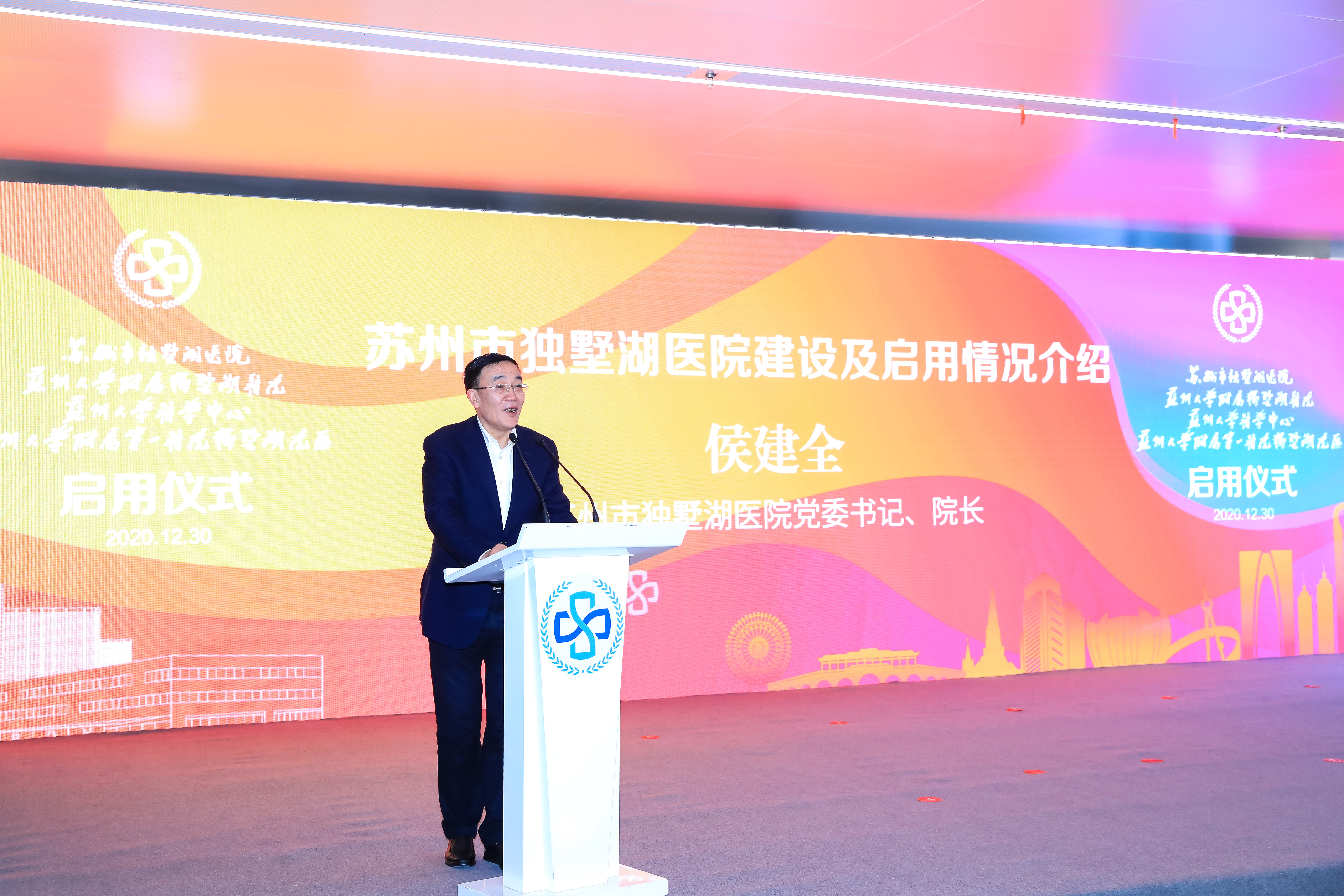 附属独墅湖医院党委书记、院长侯建全简要介绍了医院的建设及发展情况。他表示,面向未来,附属独墅湖医院一定牢记初心使命,秉承“以病人为中心、以医务人员为核心”的宗旨,不断提高科学管理、创新管理、精细管理、民主管理的水平,保障一流的就诊体验,构建和谐的医患关系,形成强大的转化能力,为更好满足人民群众对美好生活的向往、更好服务苏州建设社会主义现代化强市,打造幸福美丽新天堂而不懈奋斗。