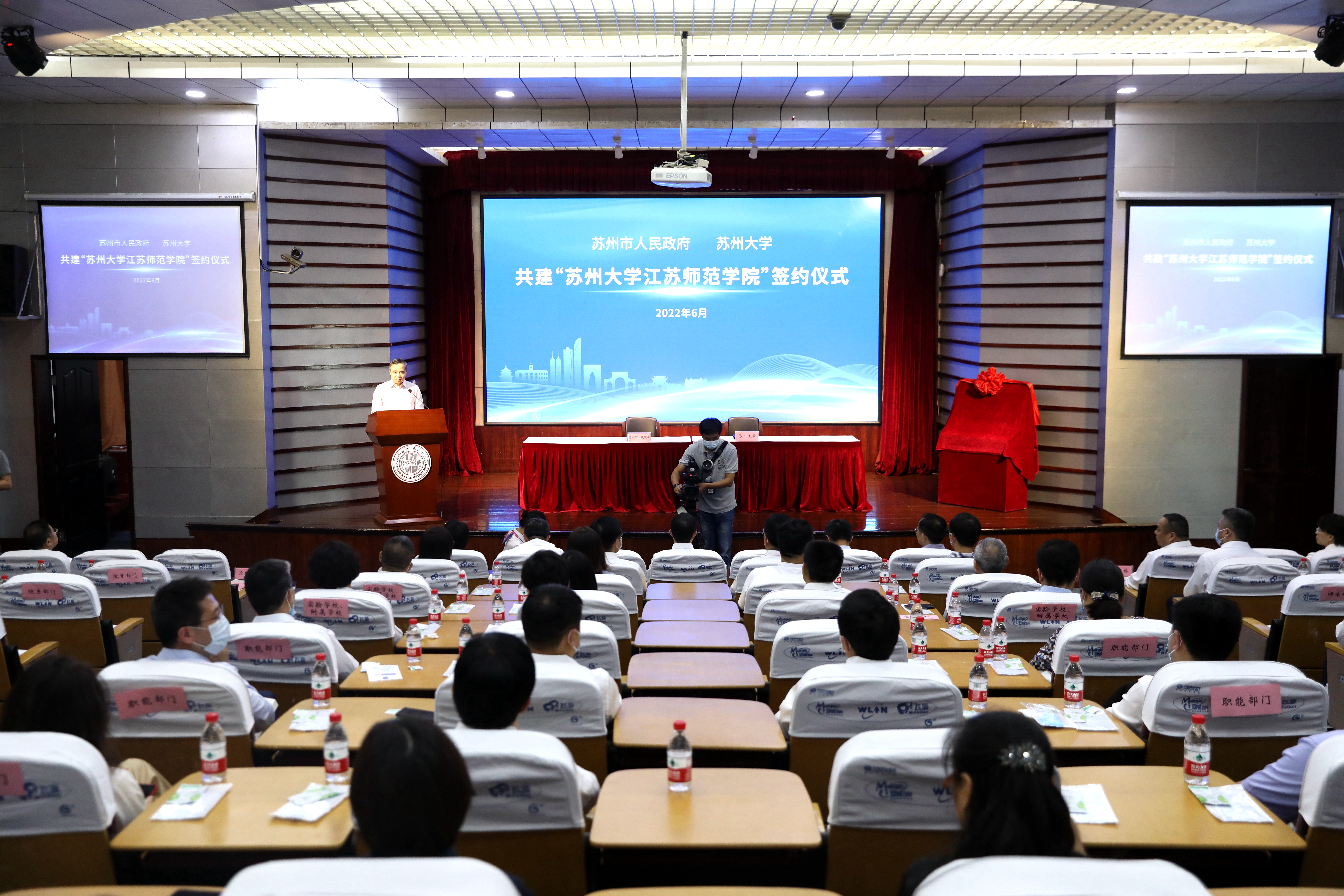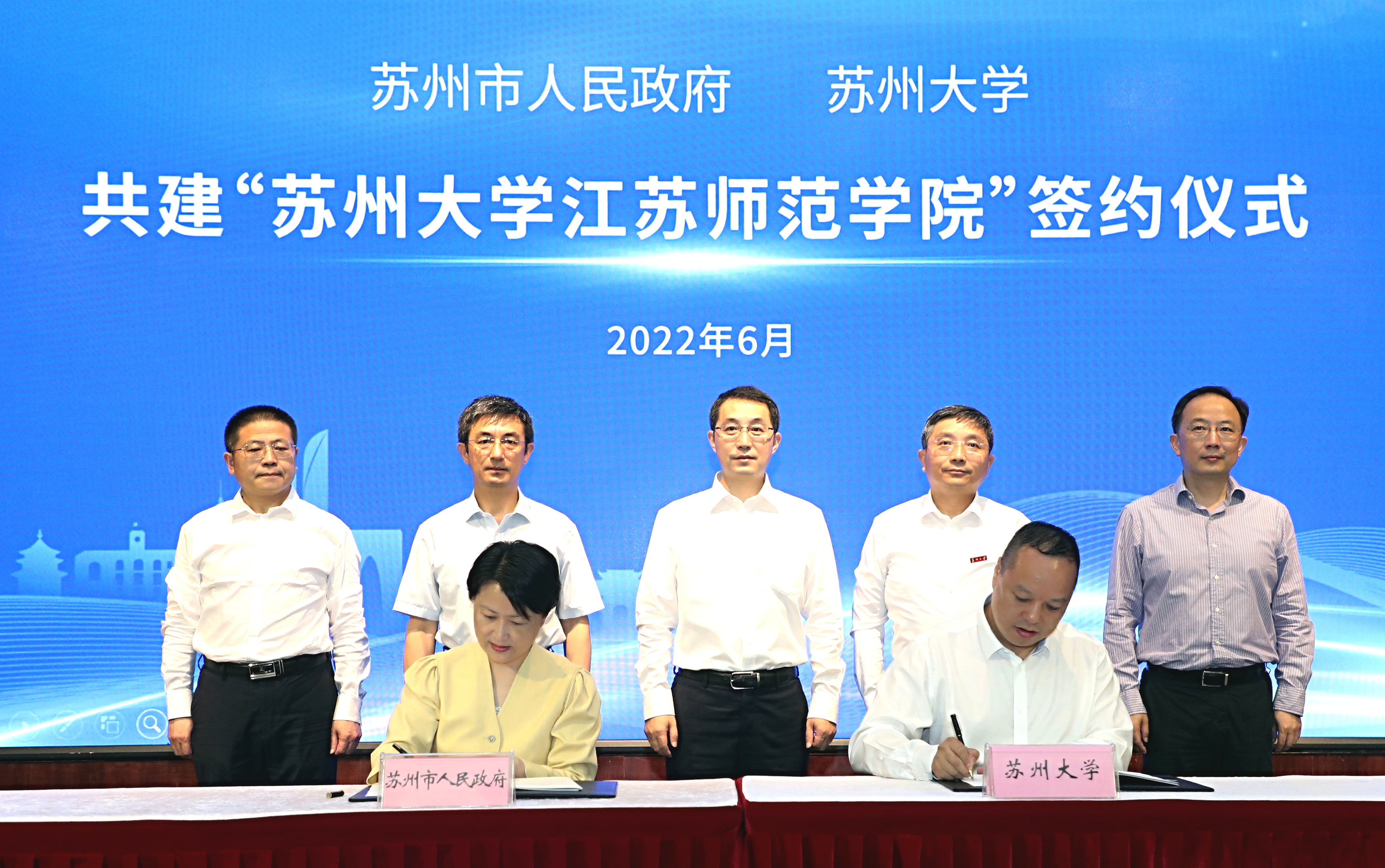 6月26日,苏州市人民政府与8868体育(中国)官方网站共建“8868体育(中国)官方网站江苏师范学院”的签约仪式在红楼会议中心学术报告厅举行。教育部教师工作司司长任友群,苏州市委副书记、市长吴庆文,苏州市副市长季晶,苏州市政府秘书长陈羔,苏州市政府副秘书长谢飞 ,苏州市教育局局长周志芳,苏州市财政局局长刘小玫,苏州幼儿师范高等专科学校校长杨建良,8868 SPORTS党委书记江涌、校长熊思东,校党委常委、副校长沈明荣、姚建林等出席活动。苏州市教育局相关部门负责人,8868 SPORTS相关职能部门负责人、相关学院领导和师生代表,以及8868体育(中国)官方网站实验学校和附属学校的领导参加了签约仪式。仪式由副校长沈明荣主持。
