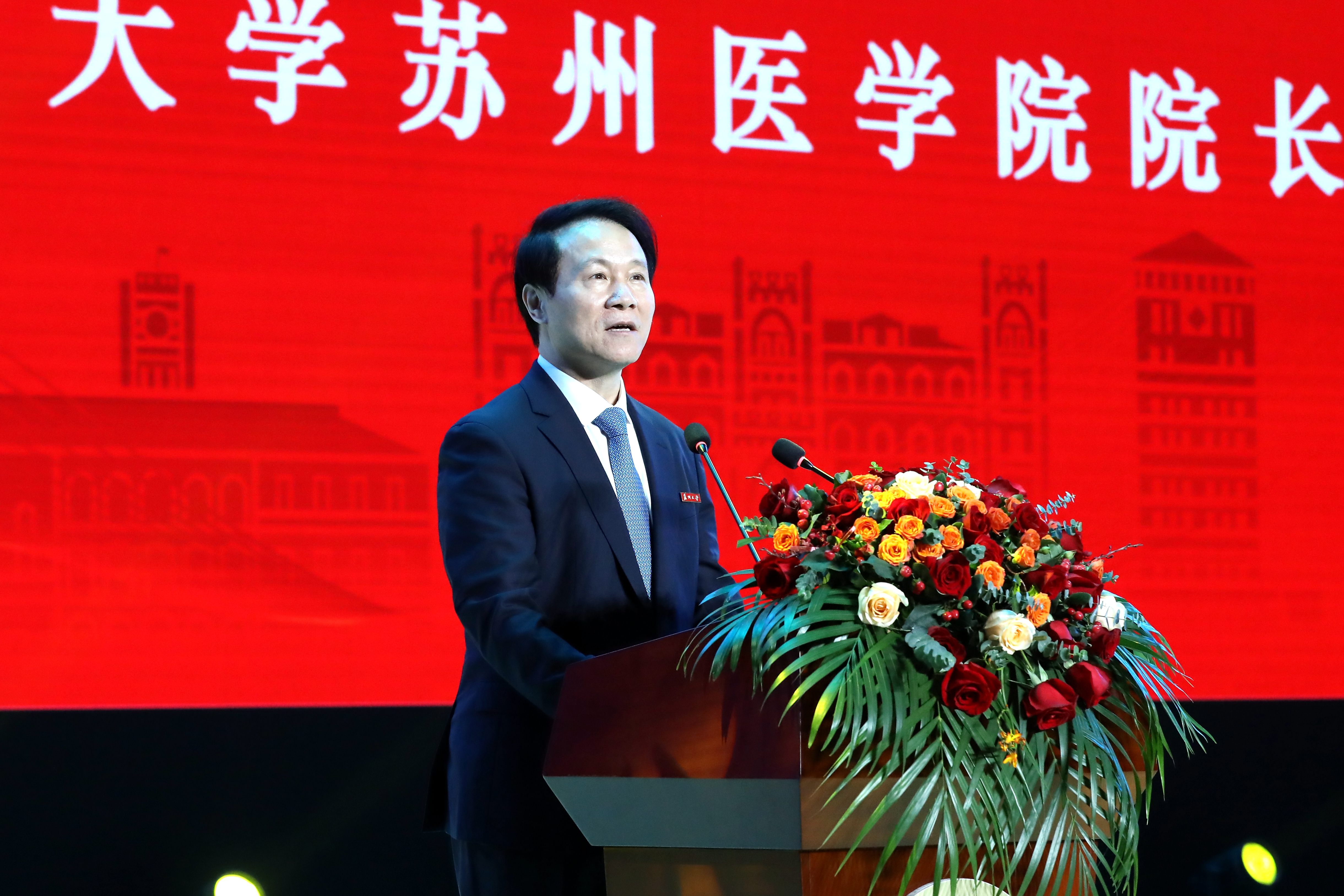 詹启敏代表学院向医学院老领导、全体师生员工、医务工作者和全球校友致以最美好的祝福,向关心支持苏州医学院发展的各级领导、专家学者和海内外各界朋友表示衷心感谢。他回顾了苏州医学院扎根中华大地开办医学教育的光辉历程,指出8868体育(中国)官方网站医学教育的历史是一代又一代苏医人接续奋斗的历史,苏医人始终与家国同心、与时代同心。奋进新征程,学院将以“四方共建”8868体育(中国)官方网站苏州医学院及附属医院为新的发展机遇,加强党建引领,积极推进医学教育改革发展,持续推进学科建设,加快建设国家医学中心,积极融入和支持苏州发展战略,努力跻身国家医学院校第一方阵,将医学院建设成为医学教育改革发展的一面旗帜,为健康中国、健康江苏建设和8868体育(中国)官方网站“双一流”建设作出新的更大贡献。