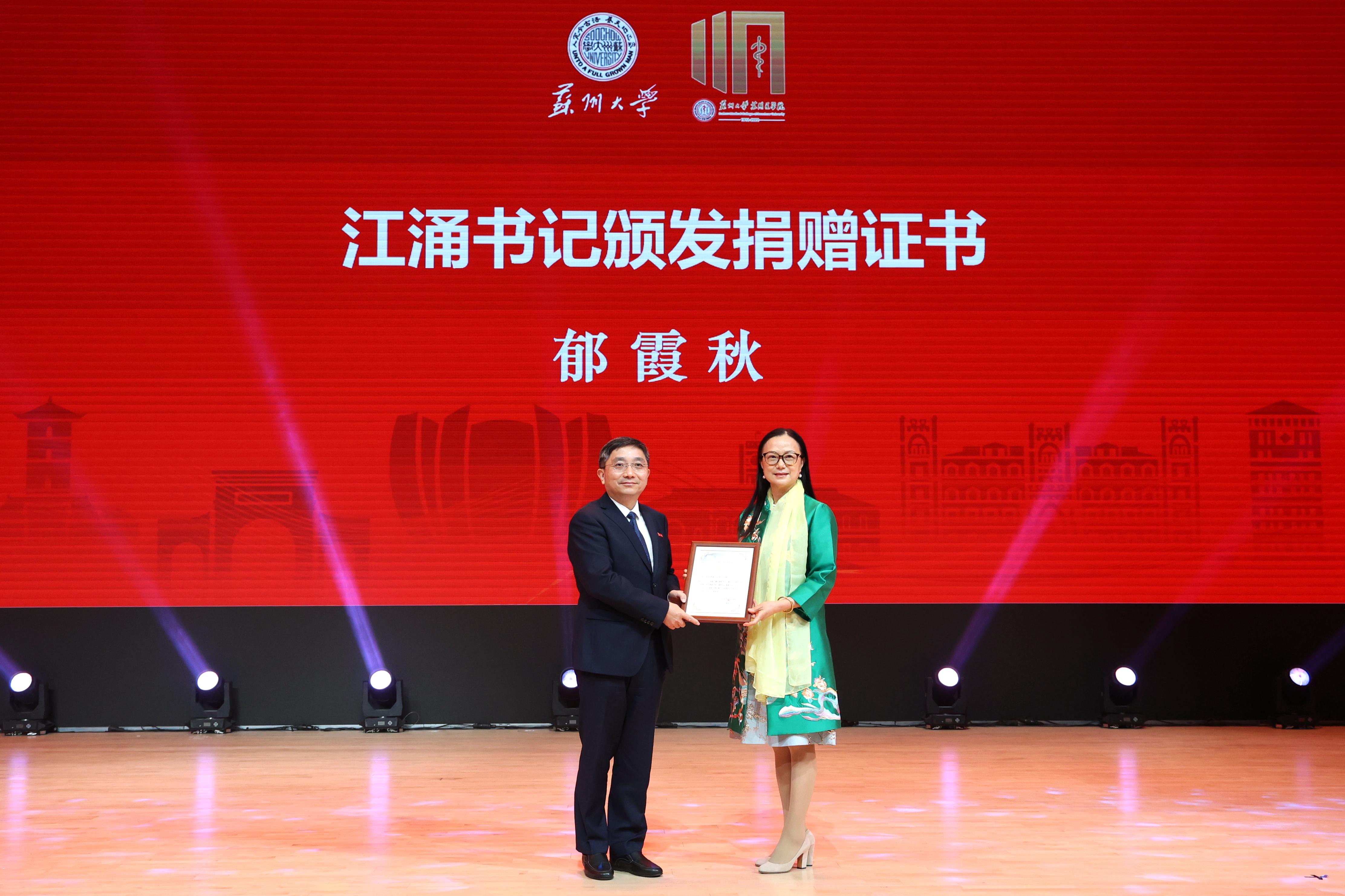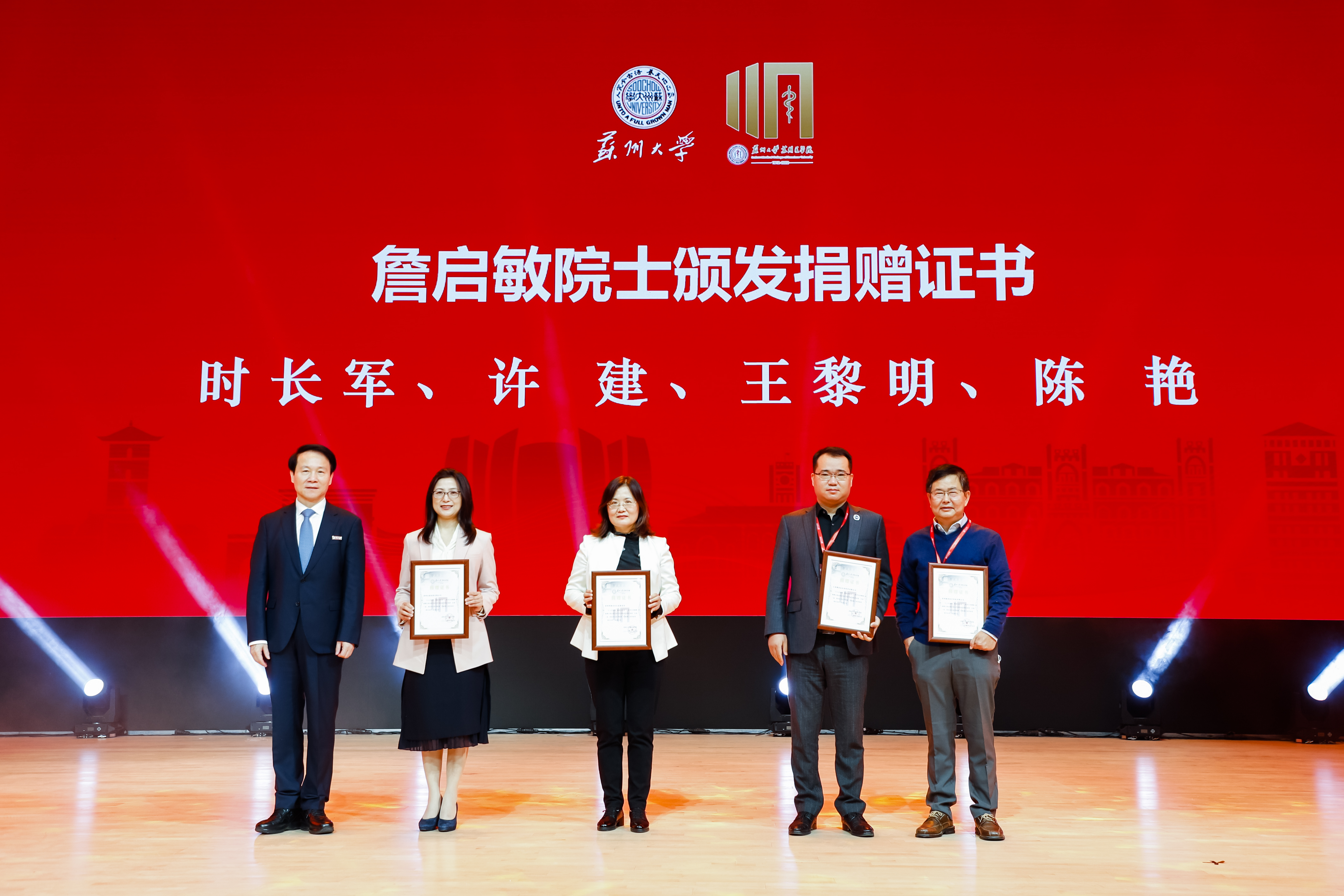 110年来,8868体育(中国)官方网站医学教育前进的每一步,都凝聚着社会组织、热心企业和广大校友在内的社会各界的鼎力支持和无私奉献。此次,苏州医学院专项发展基金捐赠代表也应邀出席大会。詹启敏院士为苏州医学院专项发展基金捐赠代表、苏州精准医疗科技有限公司董事长时长军,江苏博美达生命科学有限公司董事长许建,苏州明基友达公益基金会董事长王黎明,苏州永鼎医院有限公司院长陈艳颁发捐赠证书。