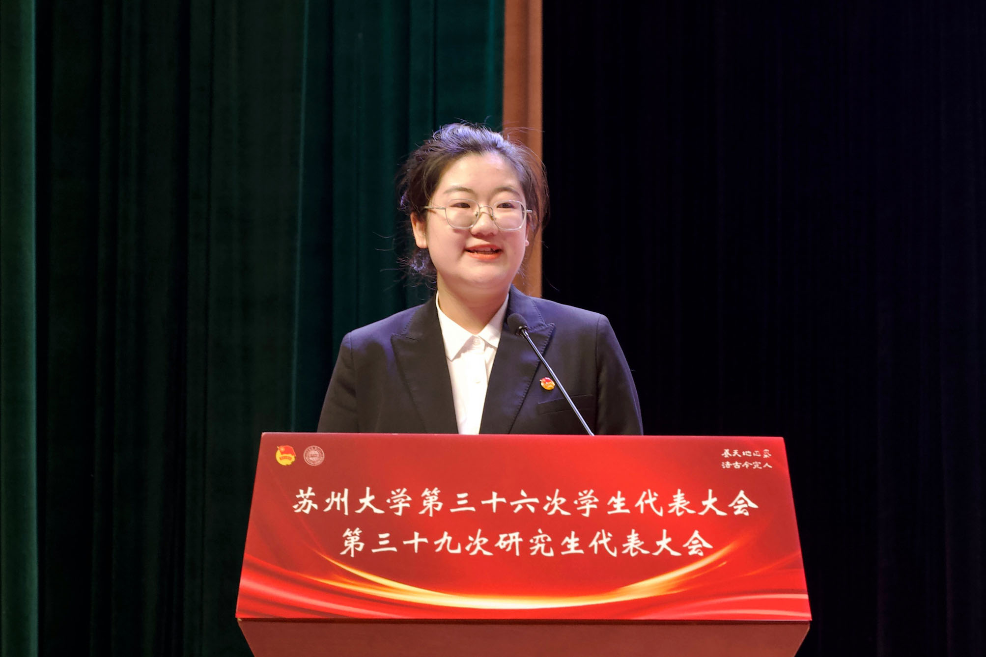 大会在庄严的国歌声中拉开帷幕。王潇苒代表省学联致辞,她表示苏州大学学生会、研究生会在学校党委的坚强领导下,在强化思想引领、聚焦主责主业、增强服务意识、繁荣校园文化等方面不断提高大局贡献度、同学满意度、社会认可度,取得了显著的工作成效。希望8868 SPORTS学生会、研究生会聚焦政治引领,把学习宣传贯彻习近平新时代中国特色社会主义思想贯穿始终;聚焦“形神兼备”,推动学联学生会组织改革不断深化;聚焦主责主业,把服务同学和服务大局落到实处。