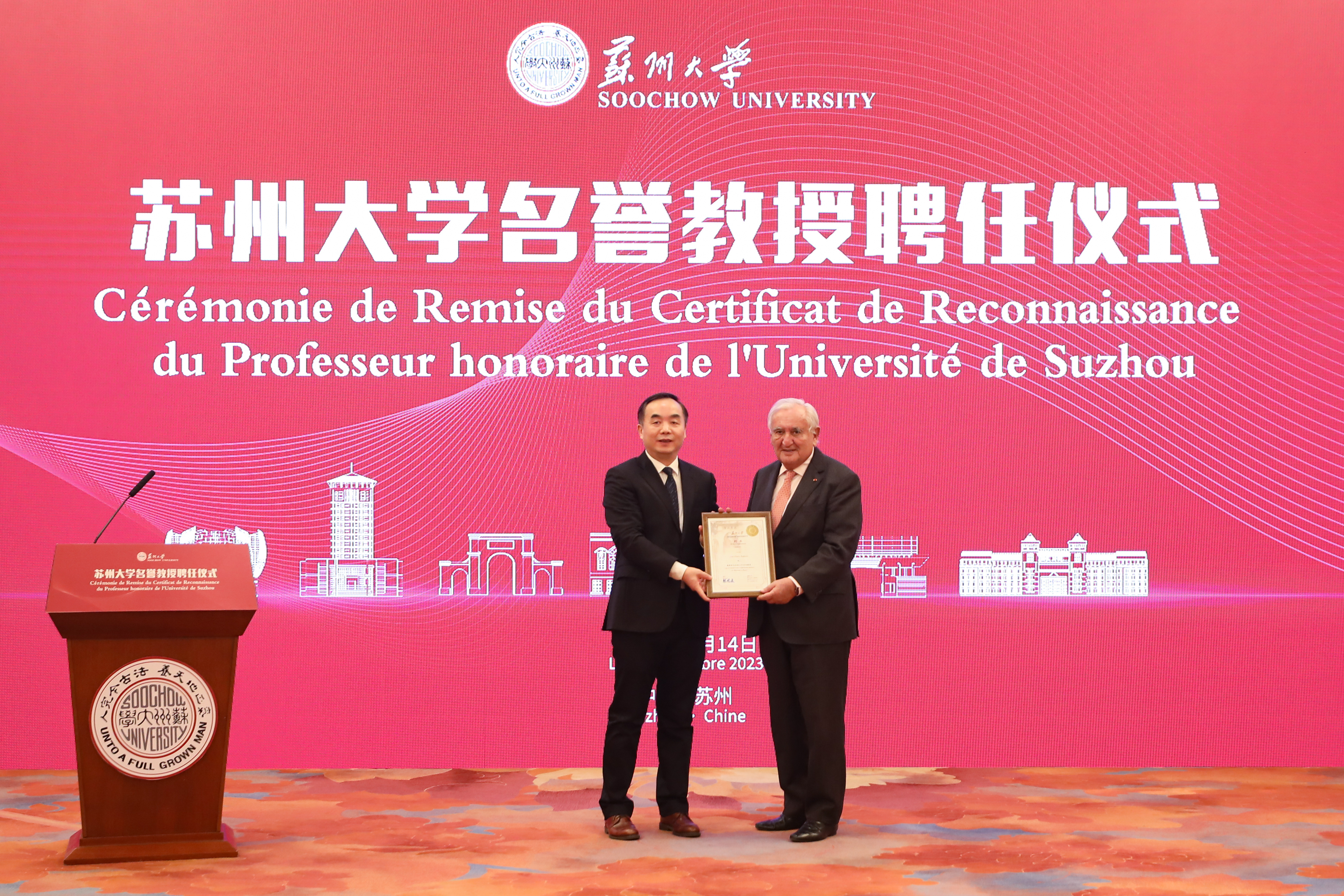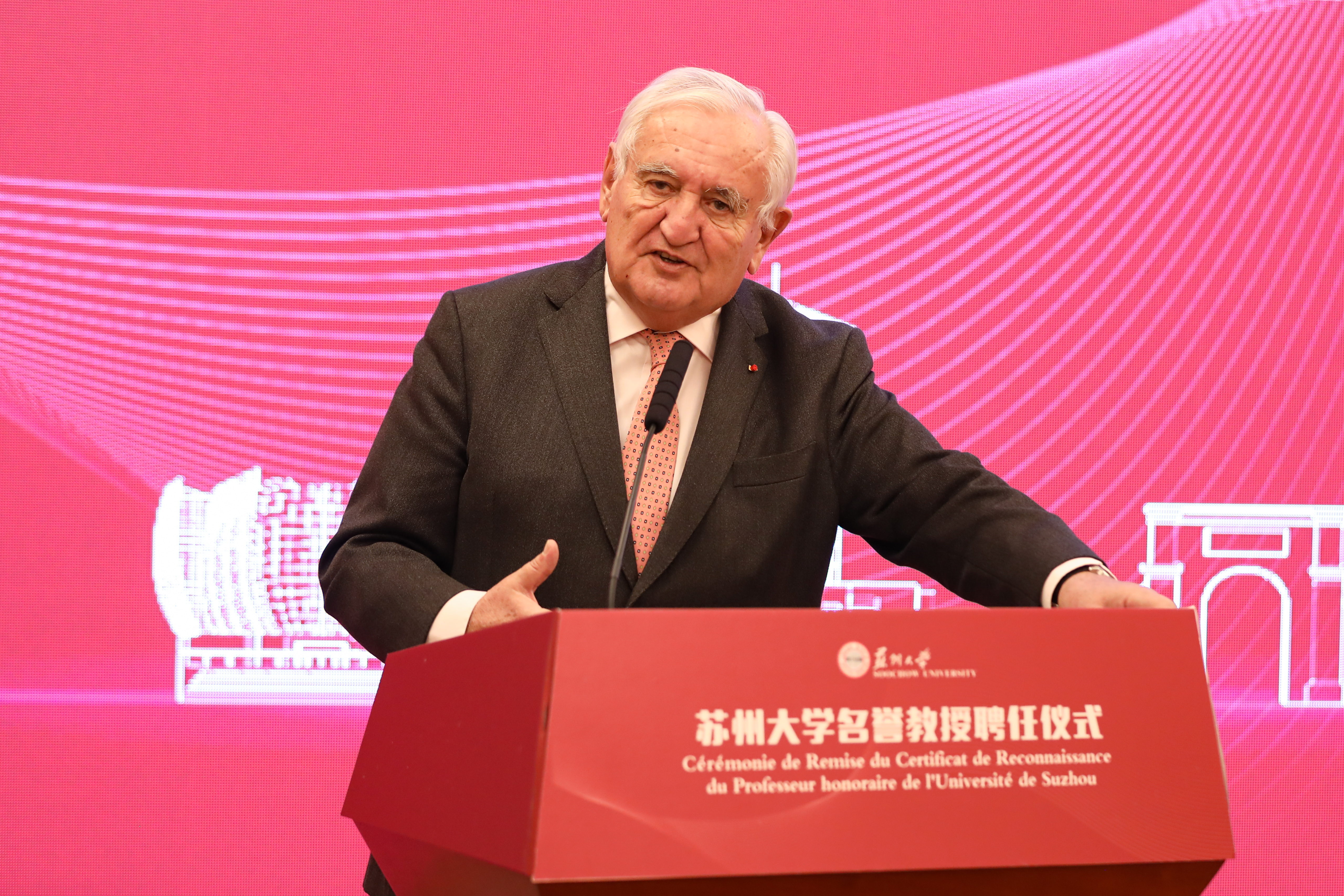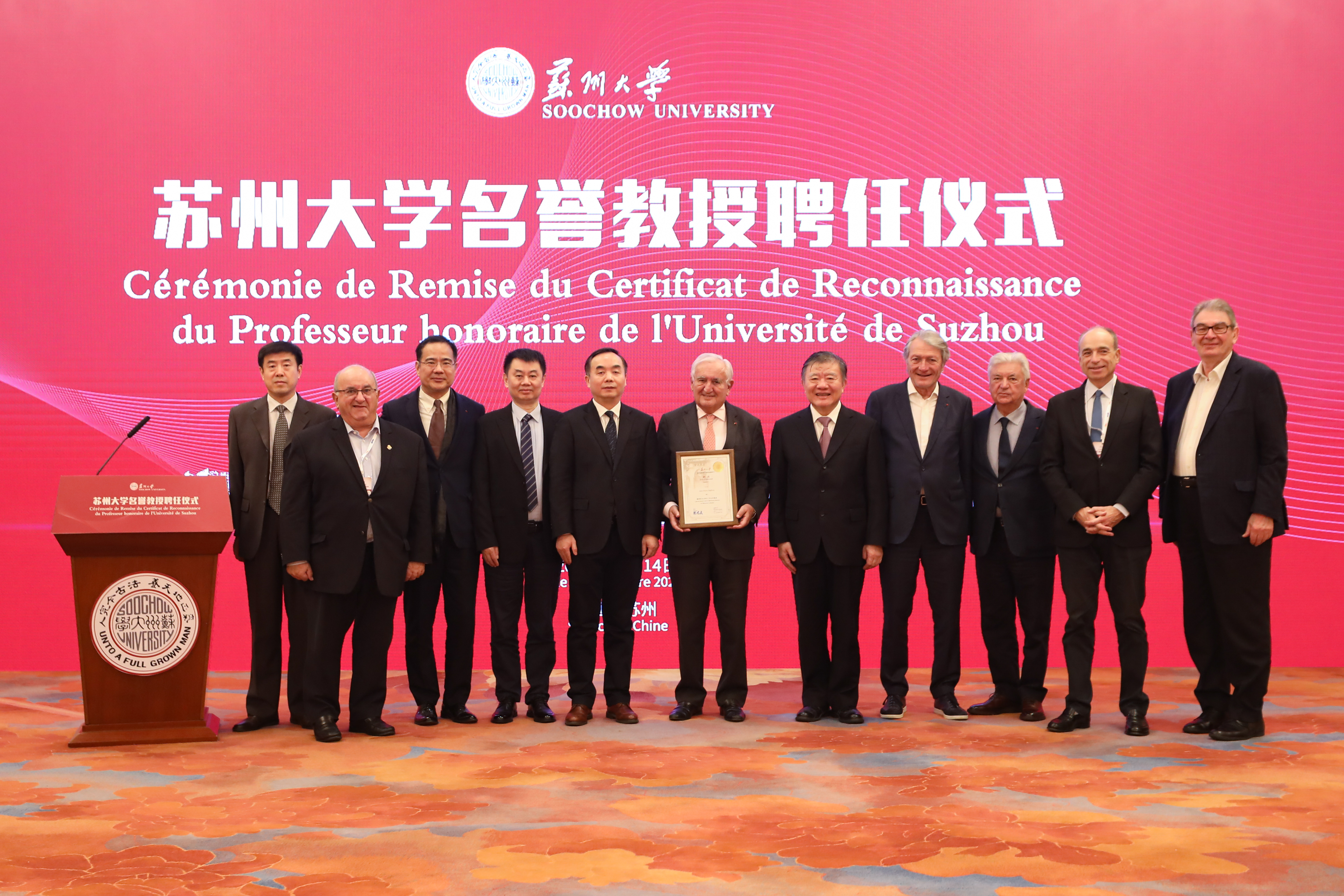 11月14日,8868 SPORTS举行法国前总理让-皮埃尔·拉法兰受聘为8868体育(中国)官方网站名誉教授的聘任仪式。法国前总理让-皮埃尔·拉法兰及法方代表,中国红十字会会长陈竺,江苏省人大常委会办公厅二级巡视员李江,江苏省教育厅副厅长袁靖宇,北京大学燕京学堂院长董强,8868 SPORTS校长张晓宏出席仪式。江苏省人大、苏州市、8868体育(中国)官方网站的相关代表参加仪式。仪式由副校长吴嘉炜主持。