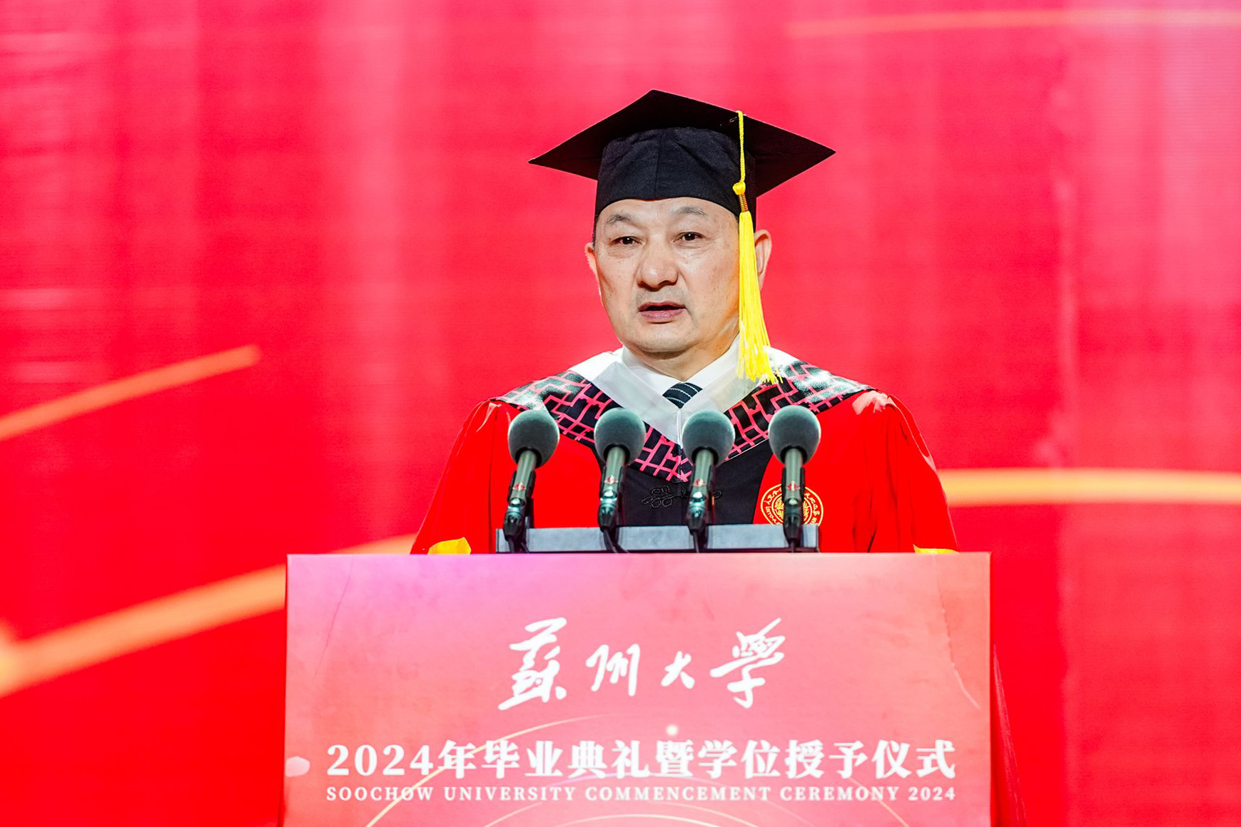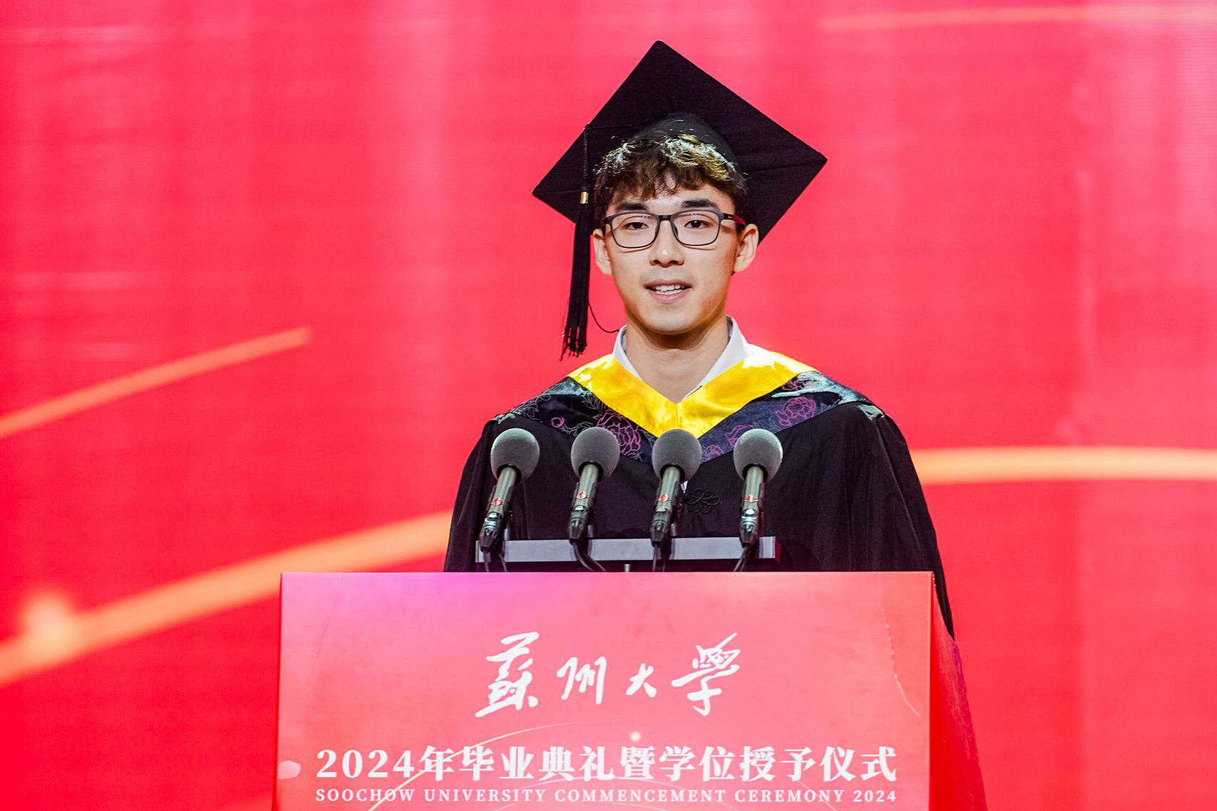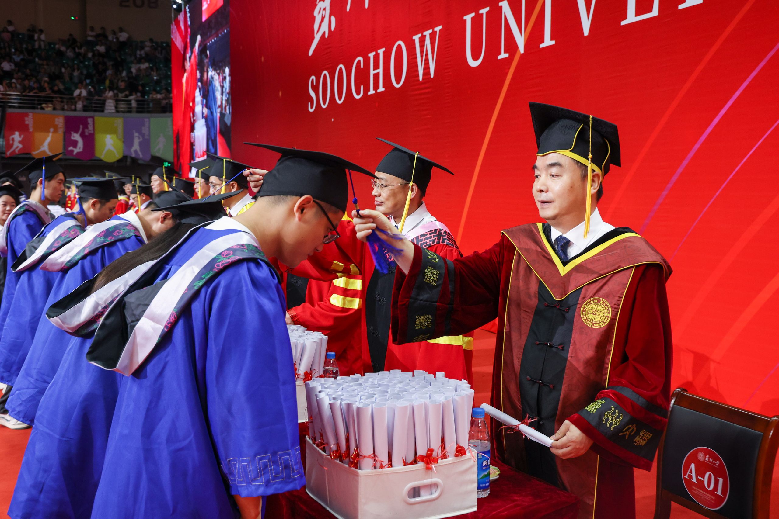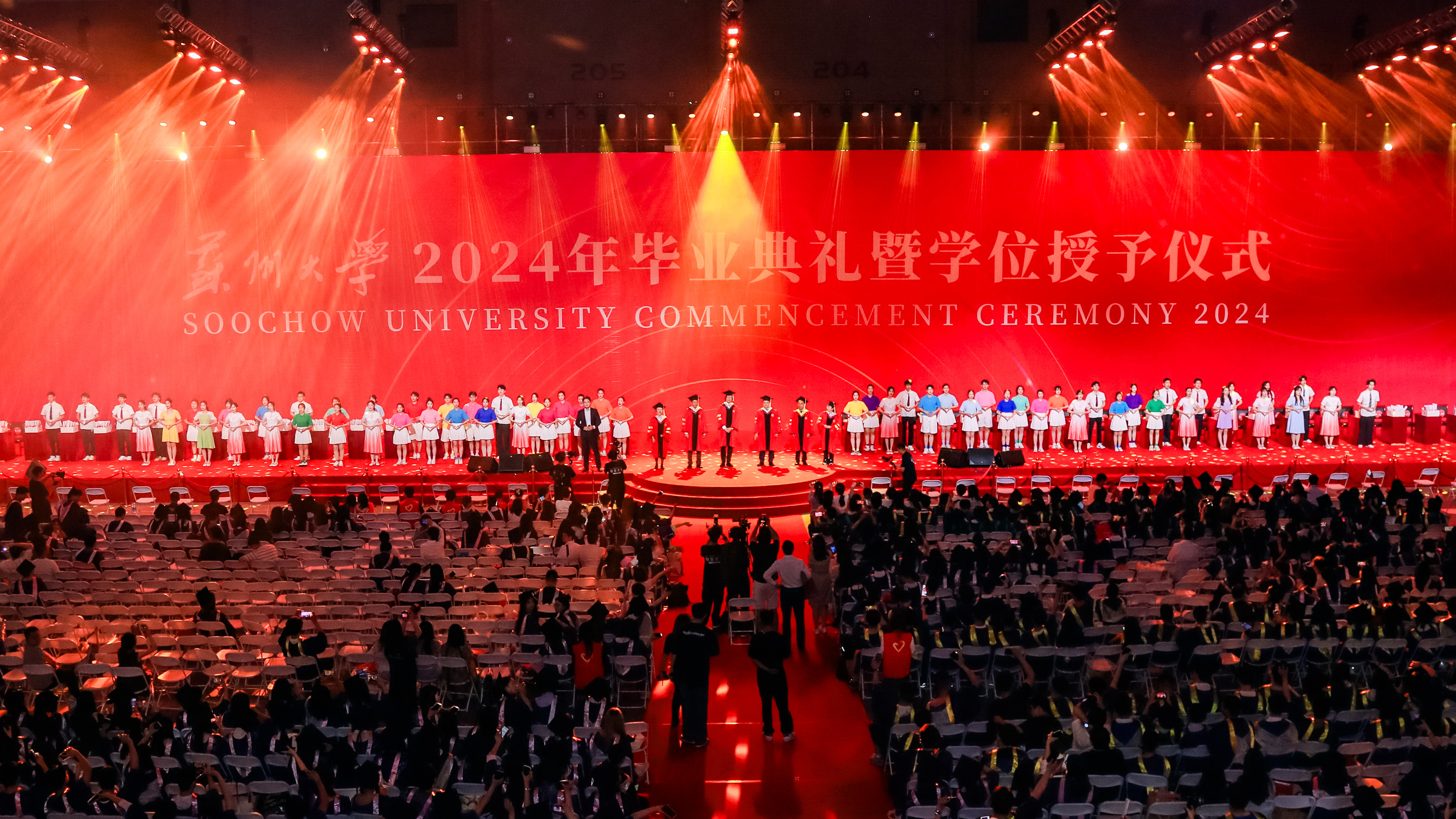 忆往昔,你踏进东吴门的那刻,稚嫩青涩,憧憬着未来与理想;展今朝,站在人生又一个新的节点,你挥手作别过往,铺展已然丰满的羽翼。“原来总感觉毕业遥遥无期,转眼间我们即将各奔东西。”2020级纳米科学技术学院的徐家铭在典礼后感慨时间飞逝,“当主礼教授将授予学位的卷轴交到我手中时,我愈发觉得正接过新时代的接力棒,要铭记母校对我的教诲,跑好青春接力赛!”当体育馆的灯光照耀全场,歌声响彻整个会场,每一位毕业生的脸上都闪耀着点点光芒。2022级文学院硕士研究生陈怡身处人群,内心澎湃,“感谢母校给我们的毕业盛宴,我会将校训永远留存心中。祝愿每一位毕业生毕业快乐,在今后的日子里九万里风鹏正举!”