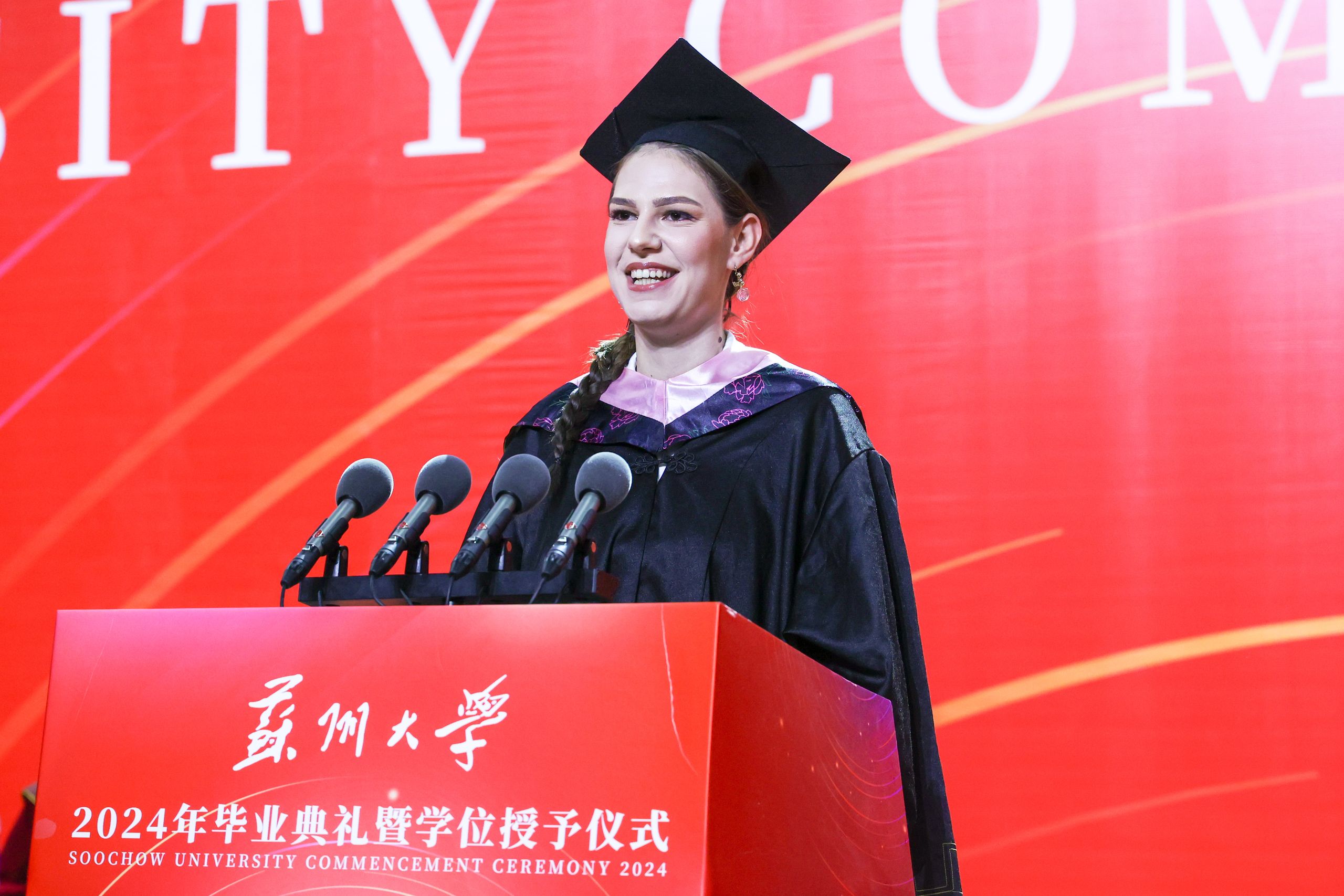 留学生代表、文学院2020级汉语言文学专业本科生马一诺,用一口流利的中文回忆了与苏州的相遇以及在8868体育(中国)官方网站学习生活的点滴。她感谢学校给予留学生们体验中国文化魅力、感受中国发展力量的机会,也期待利用所学,为促进中国、波黑文化交流和国际友谊贡献力量。