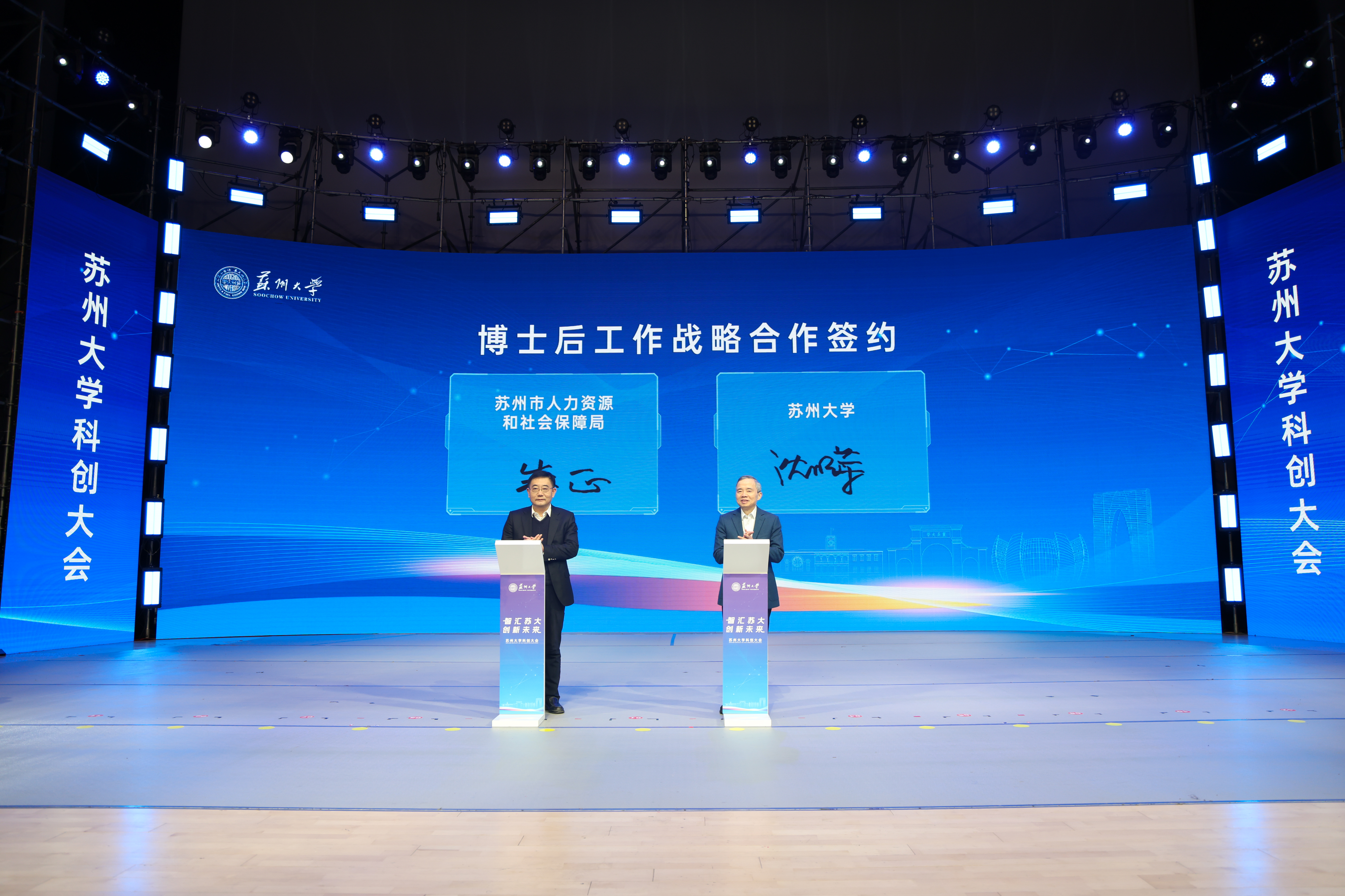 会上,苏州市人力资源和社会保障局局长、党组书记、二级巡视员朱正与8868 SPORTS党委副书记、副校长沈明荣进行博士后工作战略合作签约。