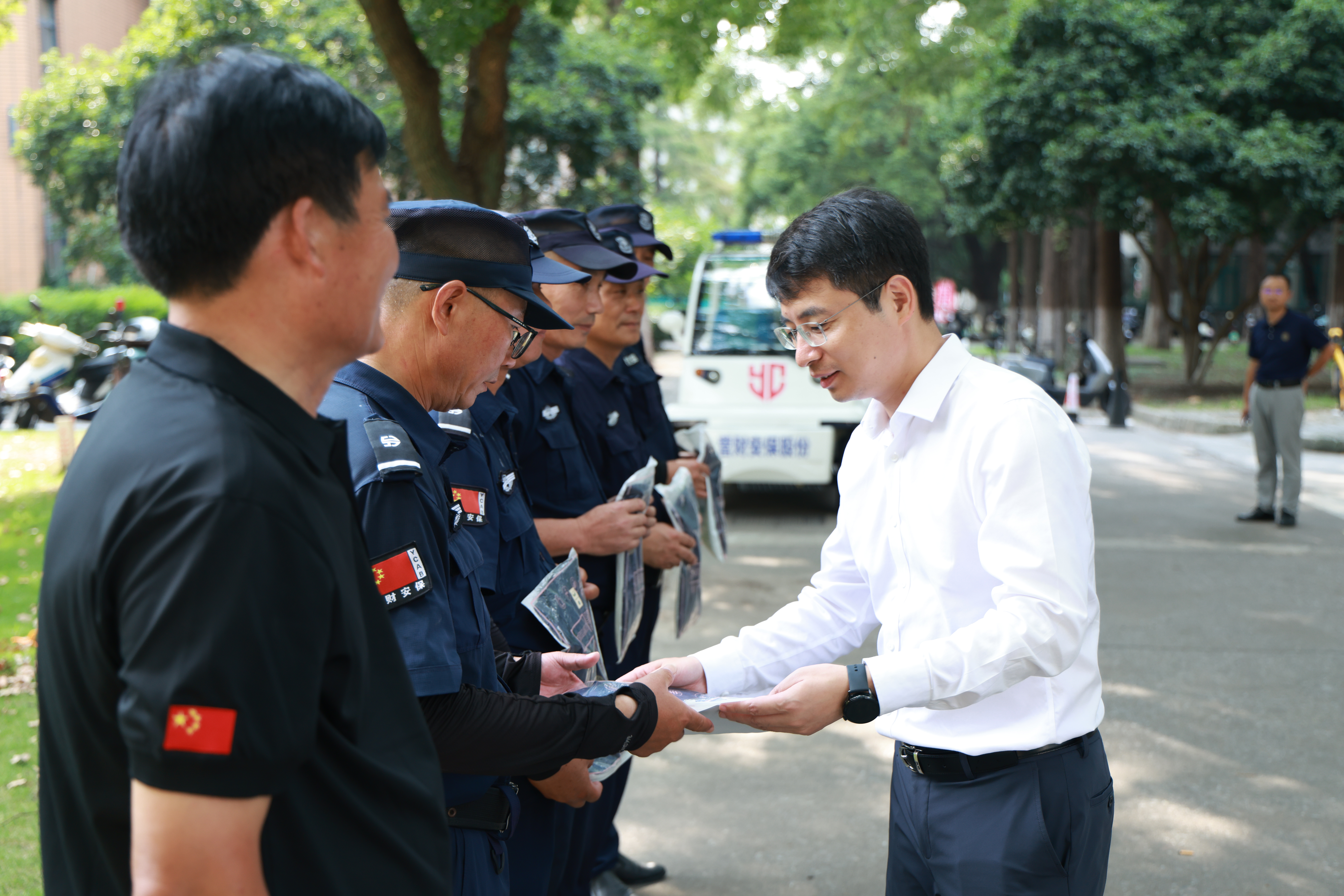 在迎新走访前,张桥专程前往天赐庄校区本部,慰问暑期校园开放期间一直坚守在工作一线的安保人员,并为大家送上迎新服装。