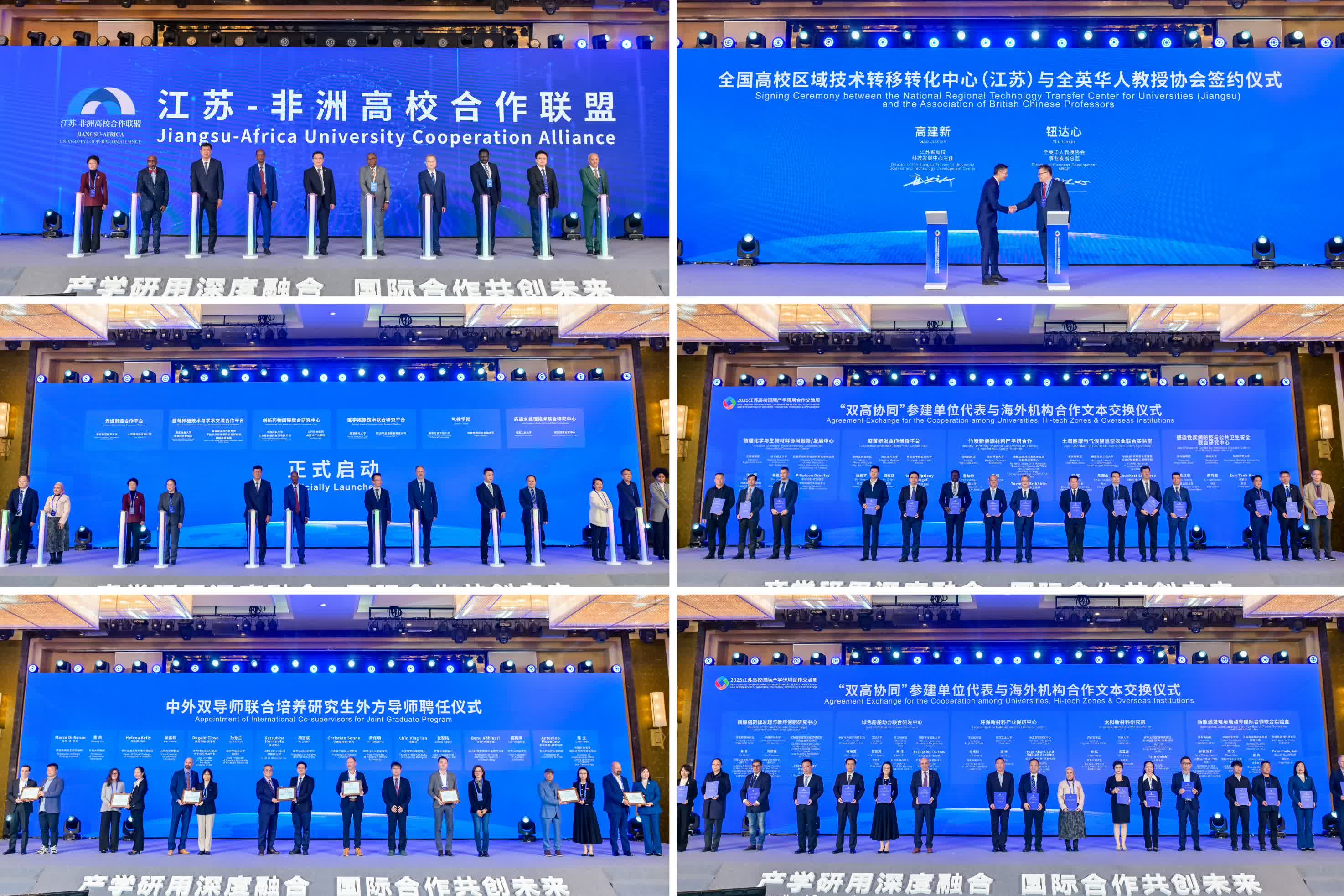 开幕式现场举行了江苏—非洲高校联盟成立仪式,发布了江苏高校国际产学研用十大合作成果。南京航空航天大学、南京农业大学等江苏高校与土耳其、美国等国外高校和企业签署了6项国际产学研用合作平台协议。东南大学、南京林业大学等8所高校现场聘任了一批中外双导师联合培养研究生外方导师。全国高校区域技术转移转化中心(江苏)与全英华人教授协会签署了合作备忘录。南京理工大学、8868体育(中国)官方网站等高校与江阴高新区、苏州高新区等高新区,以及法国国家健康与医学研究院、白俄罗斯科学院等海外机构签署了10个三方合作协议。