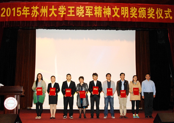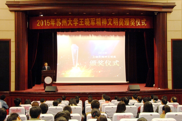 吴江首先简要介绍了王晓军烈士的事迹,随后在场观众共同观看了获奖先进集体和先进个人的事迹介绍视频。本次一共有三个先进集体和五位先进个人获得表彰,他们是:8868体育(中国)官方网站研究生支教团、8868体育(中国)官方网站东吴剧社、体育学院凝爱助残小分队,纳米科学技术学院2013级本科生王彤彤同学、文正学院2012级本科生戴鹏飞同学、医学部邓敏老师、计算机科学与技术学院2015届本科毕业生徐伟同学、东吴商学院2012级本科生庄炜同学。