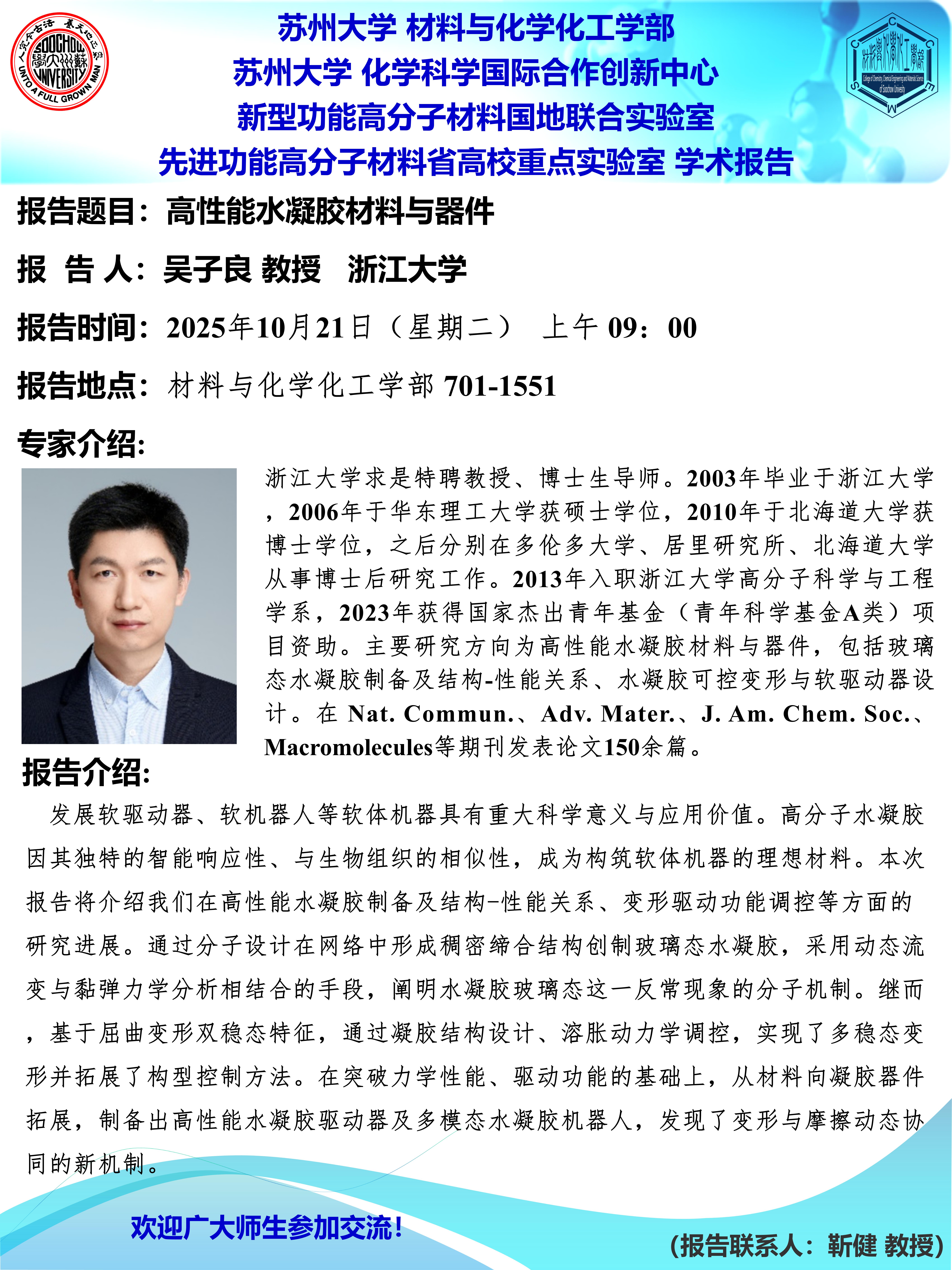 材料与化学化工学部学术报告:高性能水凝胶材料与器件